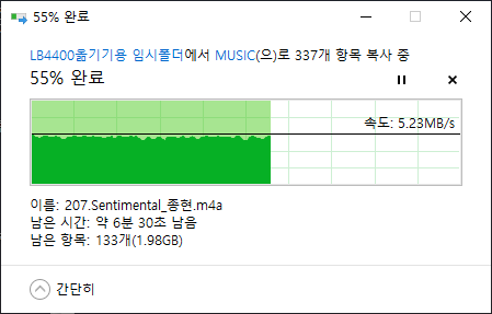 SSD -> iAUDIO U7간 파일 전송 테스트를 해봤습니다. USB 3.1 Gen 1 포트에서 진행했는데 속도는 평균적으로 5MB/s를 일정하게 내줍니다. 이전에 제가 MP3용으로 사용했던 LG-LB4400(아이리버 폰)이 10MB/s 정도였음을 고려하면 느린 속도입니다.
