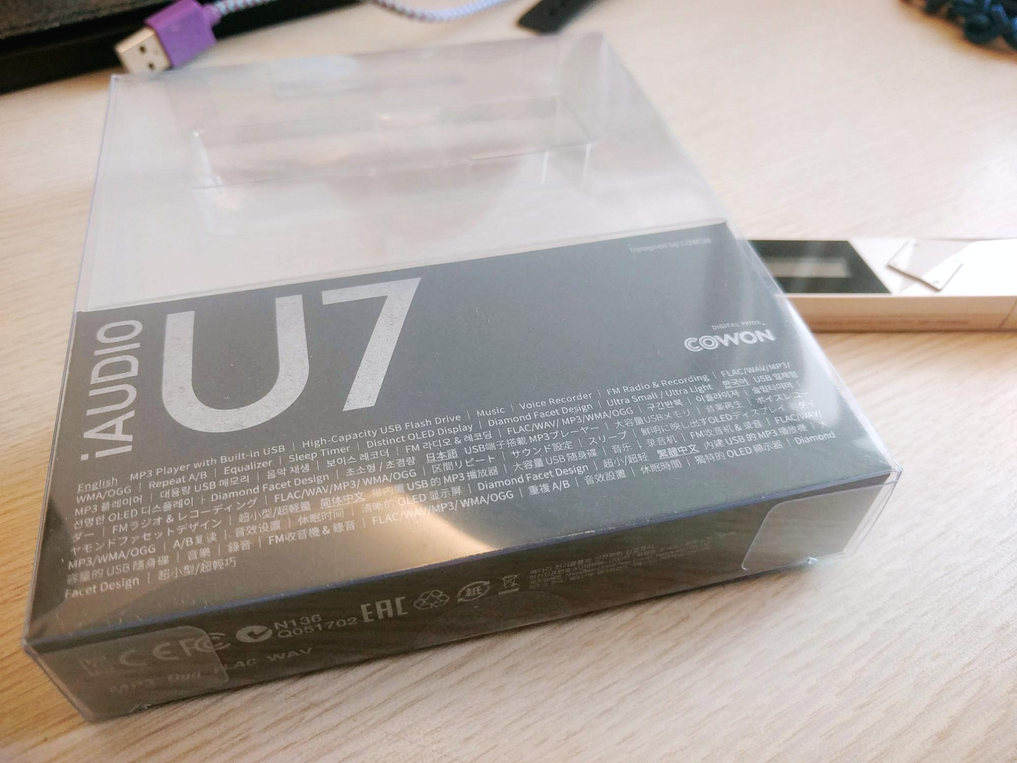 U7이라고 적힌 왼편 상단에는 Designed by COWON으로 적혀있어, 아이리버의 T70처럼 자체적으로 디자인한 제품임을 알 수 있습니다. 하지만 코원의 경우에는 제조 공장이 어디인지 적혀있지 않습니다. 중국 OEM일 것 같긴 합니다만 자체 공장이었다면 아이리버처럼 자체 공장이었음을 명시했으리라 생각합니다.