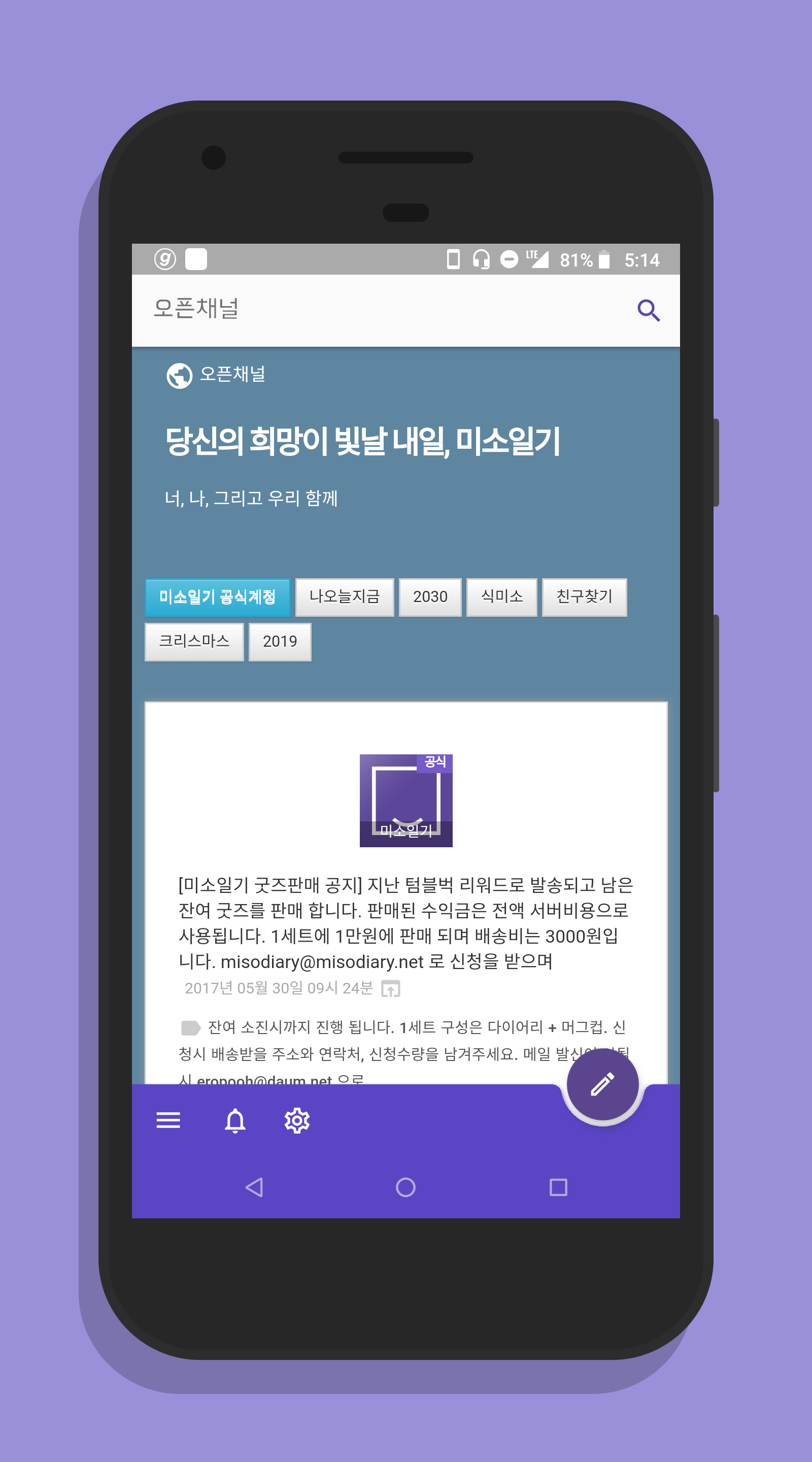 아직 3~4분밖에 사용하지 않는 앱이지만, 더 많은 분들에게 사랑받을 수 있도록 최선을 다하겠습니다. 주변에 미소일기를 사용하고 계신 안드로이드 사용자 분이 계시다면 알려주세요. 더 많은 사용자가 모일 수록 앱은 발전합니다.
