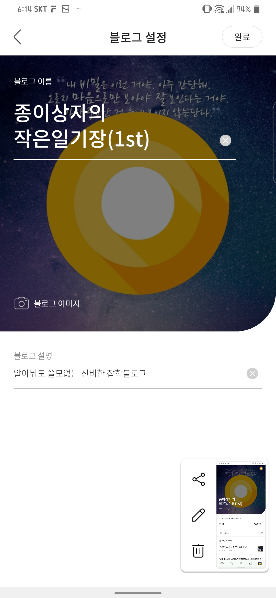 블로그 관리 기능에는 별로 차이가 없었습니다. 여전히 편집은 안 되지만 카테고리를 볼 수 있고, 블로그 이름과 설명을 편집할 수 있으며, 프로필 사진을 새로 업로드할 수도 있었습니다.