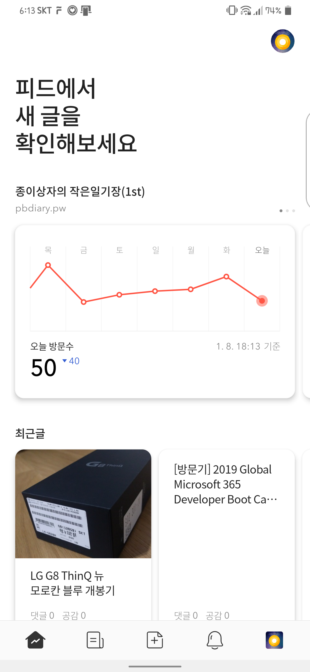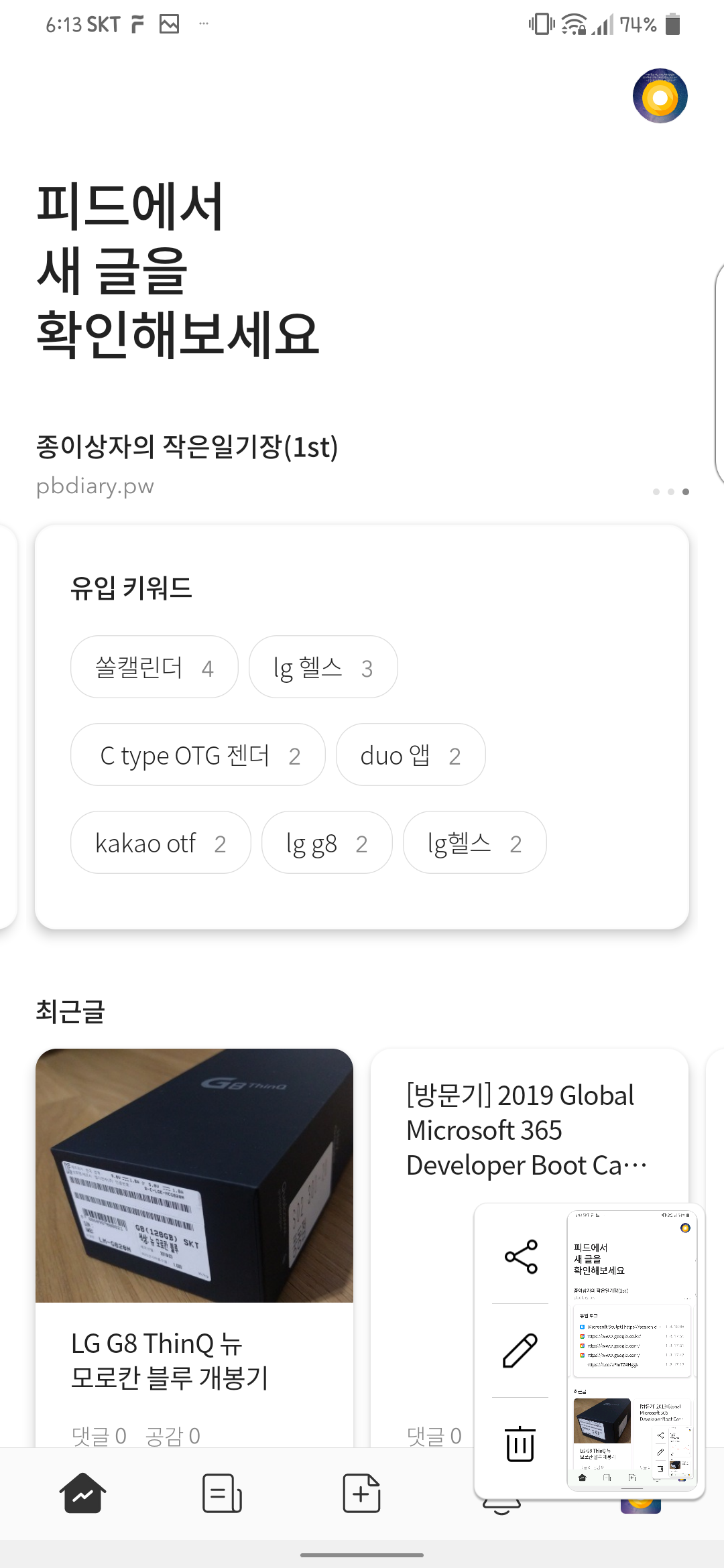 특히 블로그를 관리하는 입장에서 보면, 첫 화면에서 별로 좋은 그래프 모양은 아니지만 통계를 바로바로 확인할 수 있는 점이 좋아졌습니다. 이전에는 인기 글 보기가 기본 값이었고, 바꿀 수 없었기 때문에 자신의 블로그의 정보를 보러 왔다 해도 한 차례 햄버거 메뉴를 거쳐야만 했습니다. (* 물론, 당시에는 글쓰기 버튼이 오른쪽 하단에 버블형으로 있었기 때문에 글을 쓰는 데는 문제가 없었습니다.)