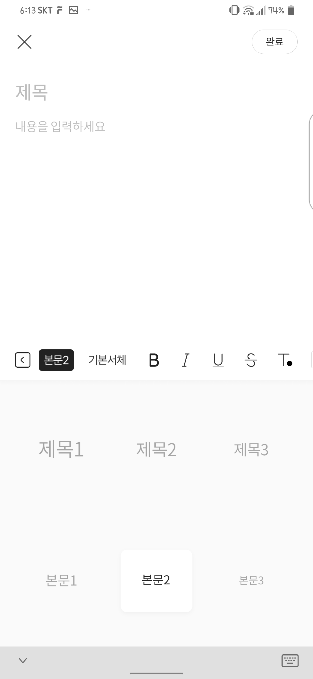 글쓰기 화면도 깔끔해졌는데, 이미지 / 서식 / 정렬 세 가지로 정리한 다음 서식 관련으로 수정할 사항이 있으면 눌러서 바꾸는 방법으로 바뀌었습니다. 하단에 많은 요소가 차지하고 있어 난잡했던 과거와 확실히 다른 점입니다.