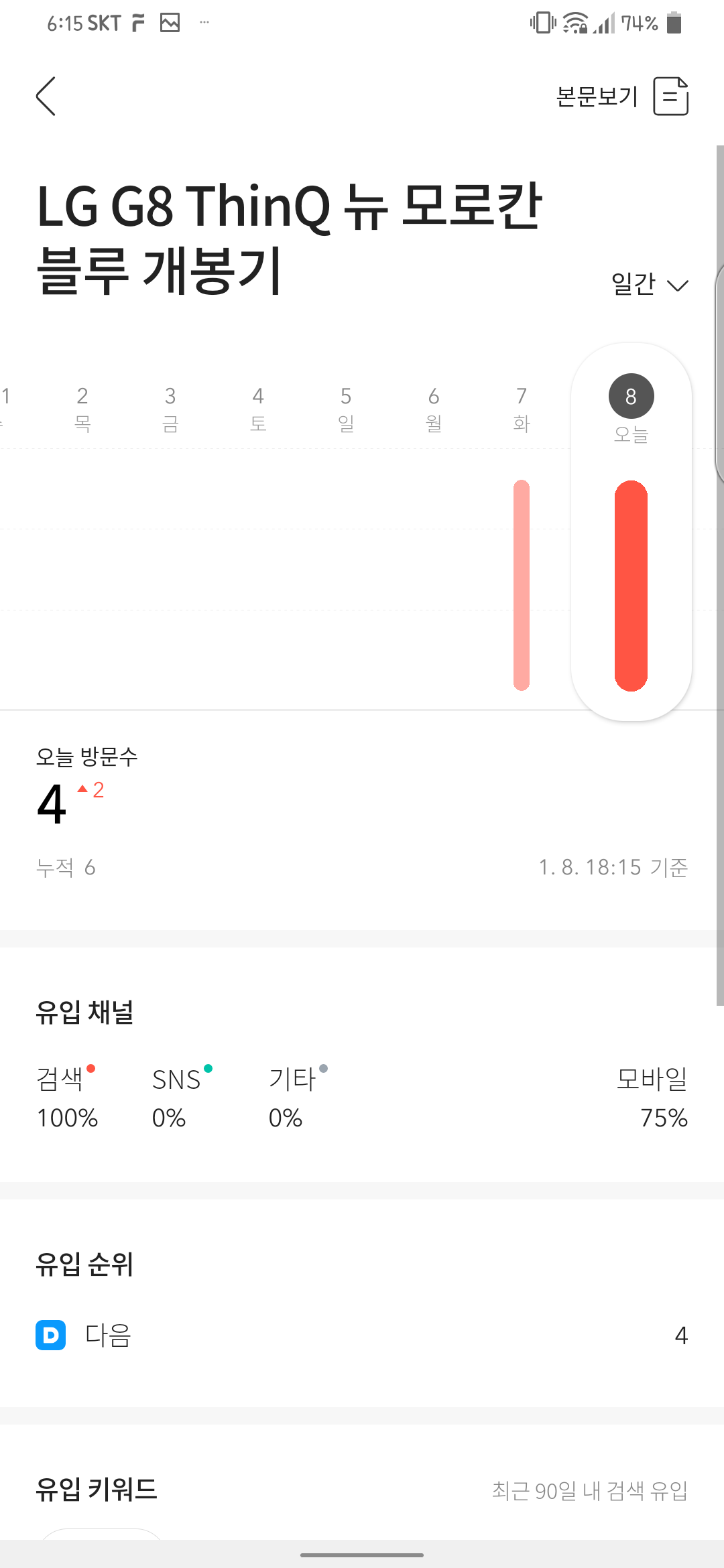 이제 그 부분이 개선되어, 기존 통계 기능은 보기 좋게 만들고 개별 글 통계도 볼 수 있게 변경되었습니다. 지금 위 사진에는 나와있지 않지만 유입 로그나 키워드도 저 몇 개만 보여주고 마는 것이 아니라, 카드를 누르면 이전처럼 촤르륵, 하고 리스트가 나타나게 변경되었으며 보여주는 양도 늘었습니다.