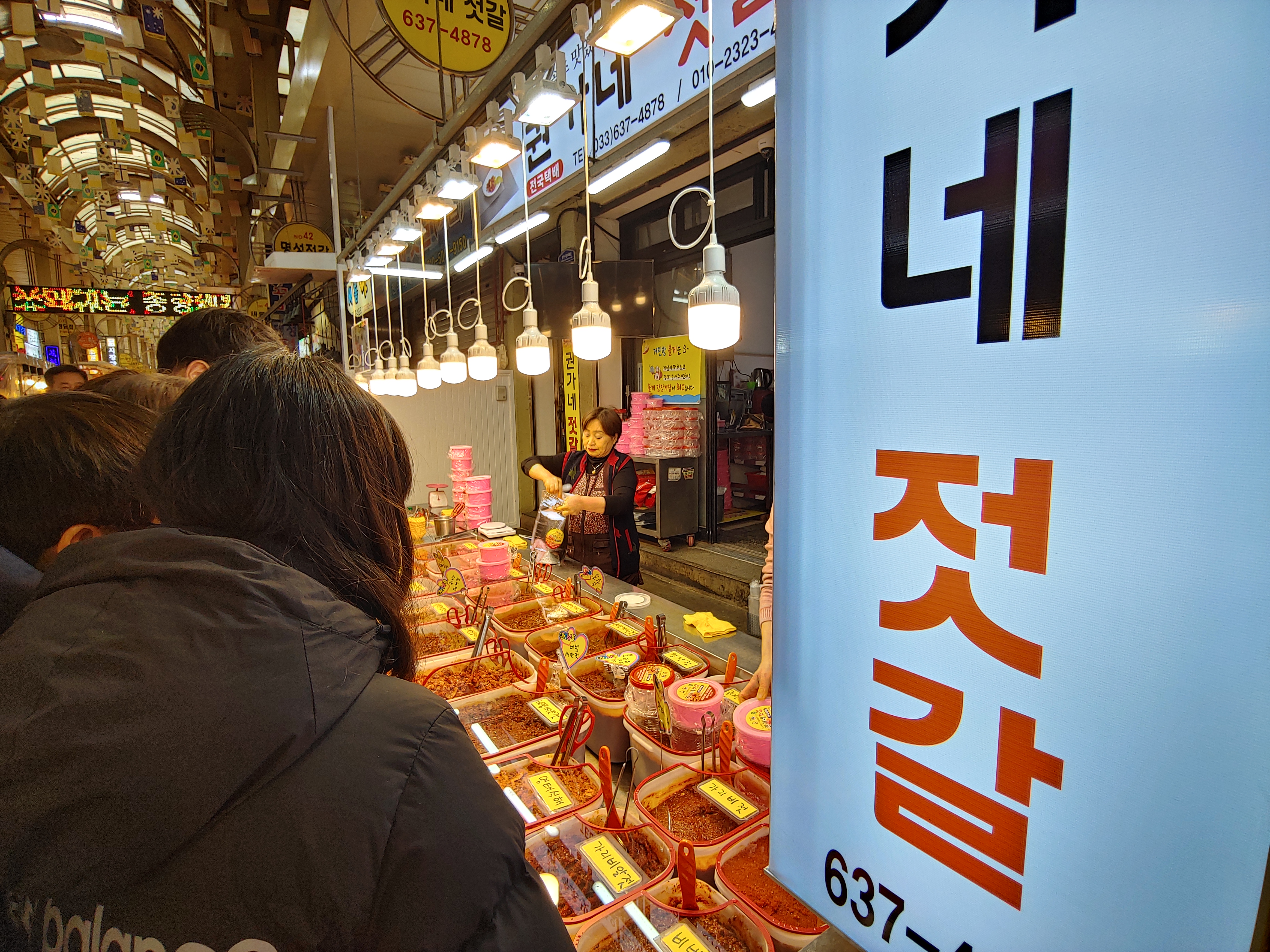 동생이 좋아하는 젓갈도 사러 '권가네 젓갈'이라는 곳에도 왔습니다. 전에 온 곳과는 다른 곳인데 통은 비슷하게 항상 분홍색을 쓴다는 점이 신기합니다.