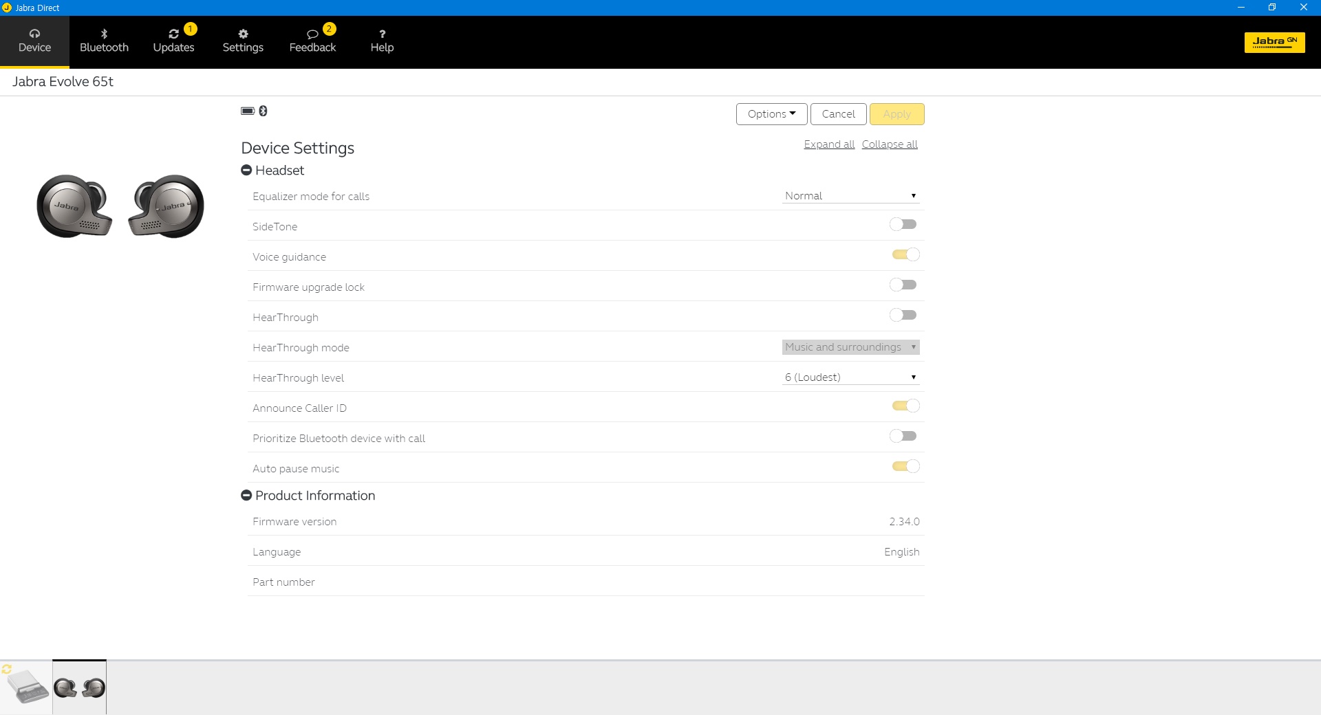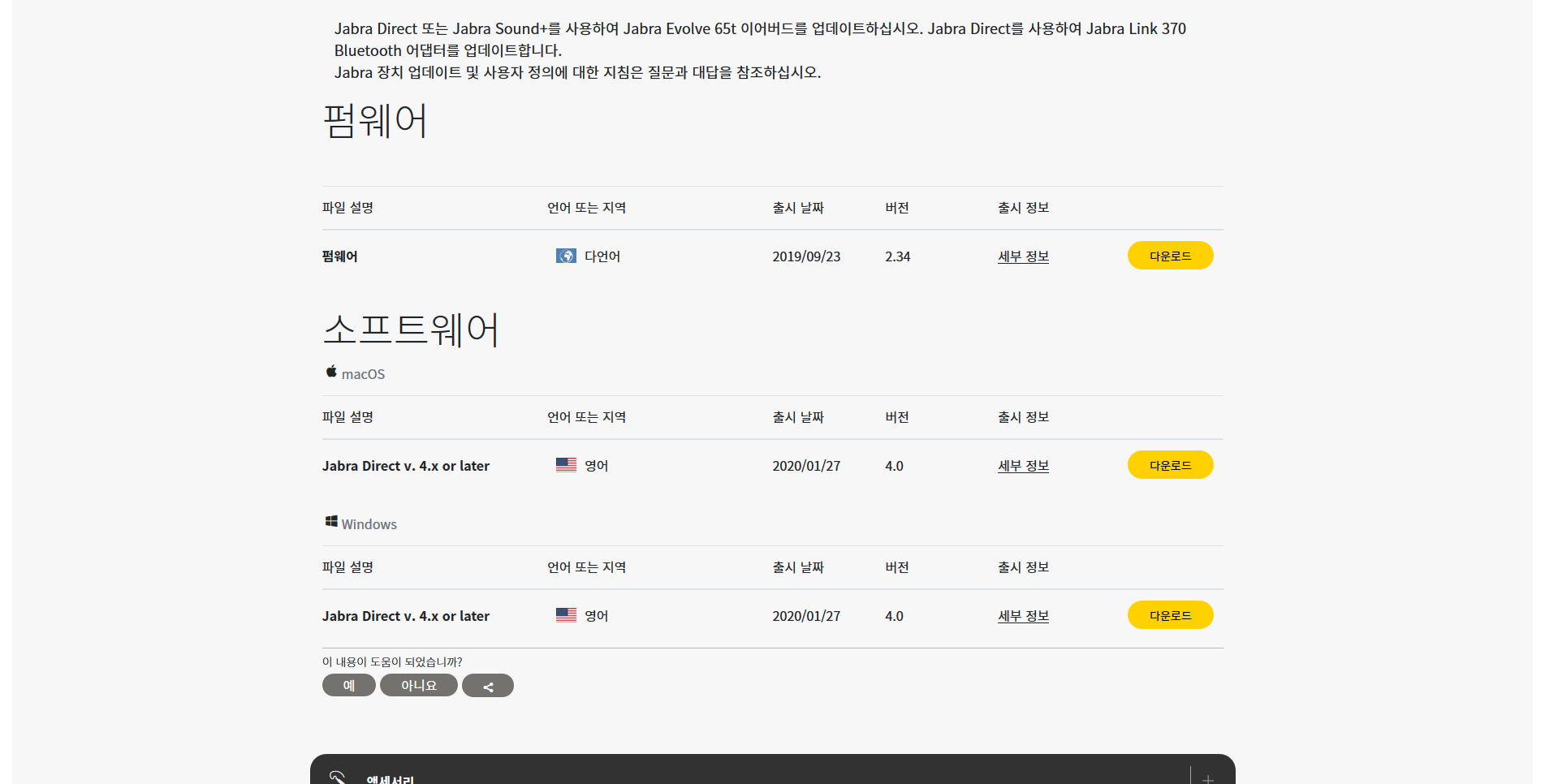별도의 소프트웨어를 내려받지 않아도 기본적인 음악 듣기 등은 가능하지만, 펌웨어 업데이트 및 음향 조절을 위해서는 Jabra Direct라는 소프트웨어가 필요합니다. Windows와 macOS용으로만 지원되며, 한국어로는 지원되지 않는 게 아쉽습니다. 그래도 설명서와 모바일 앱은 한국어로 번역되어 있으니 사용하기 불편하시다면 Android 및 iOS 기기에서 주로 사용하시는 게 좋을 것 같습니다. 참고로 모바일 앱의 이름은 Jabra Sound+라는 명칭입니다. 제품 등록, 주변 소리 듣기 모드 조절, 정확한 배터리 잔량 확인 등이 가능합니다.