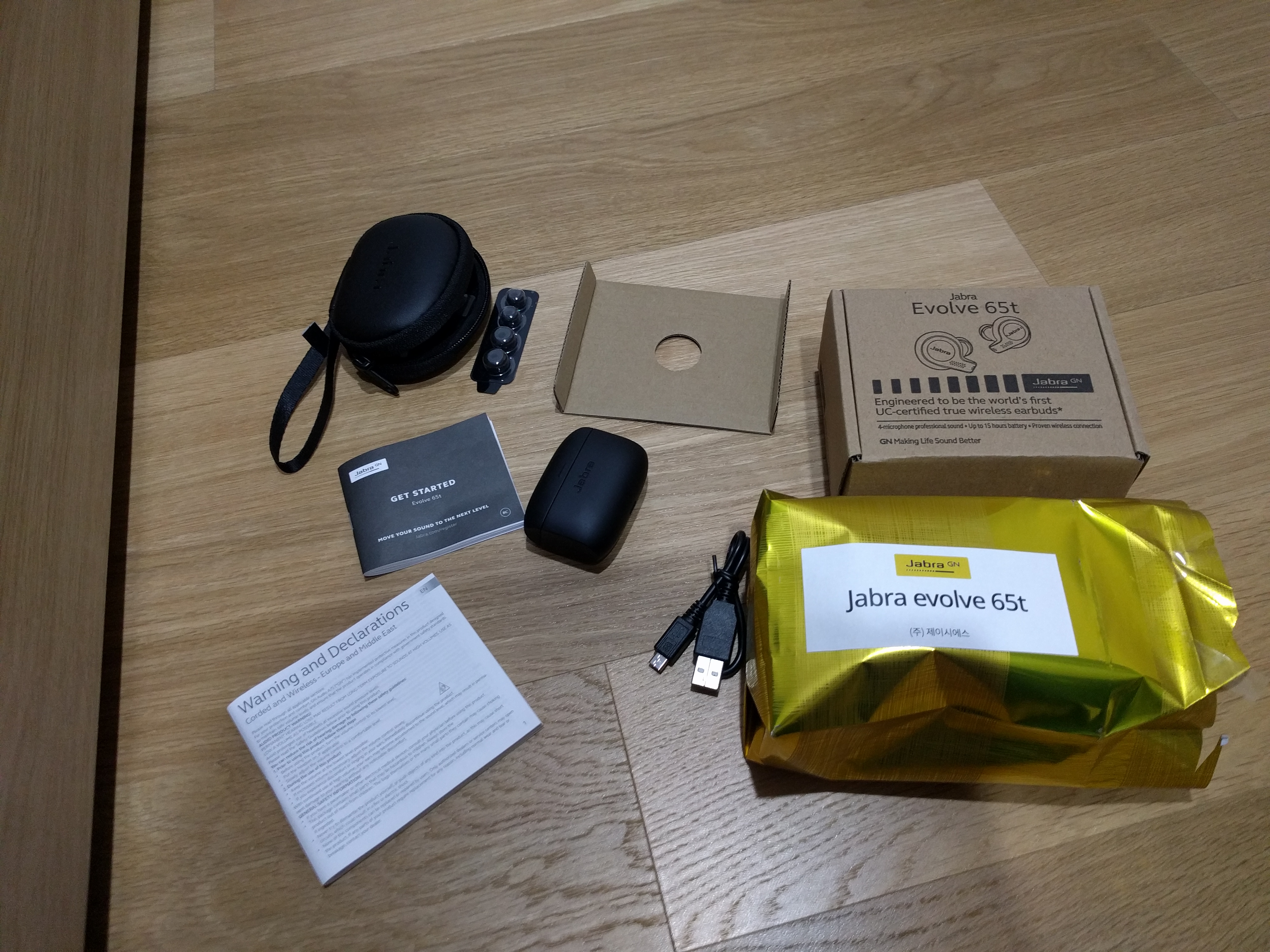 Jabra Evolve 65t는 비지니스 위주의 제품이어서 그런지, Elite 시리즈와 달리 포장이 상당히 간소합니다. 애플 에어팟에 맞먹는 가격이란 걸 생각해보면 지나치게 간단한 포장이 아닌가 싶기도 합니다만, 대신 들어있을만한 것은 다 들어있습니다.