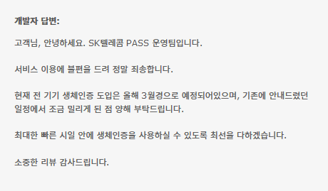 이 글에 제시된 스크린샷은 모두 SKT PASS 운영팀의 답변을 그대로 캡처하여 옮겨온 것으로, 이름 등 개인정보를 제외하고 편집 없이 게재하였습니다. 그러나 PASS 운영팀의 사정에 따라 실제로 다음달에 업데이트가 되지 않을수도 있습니다.