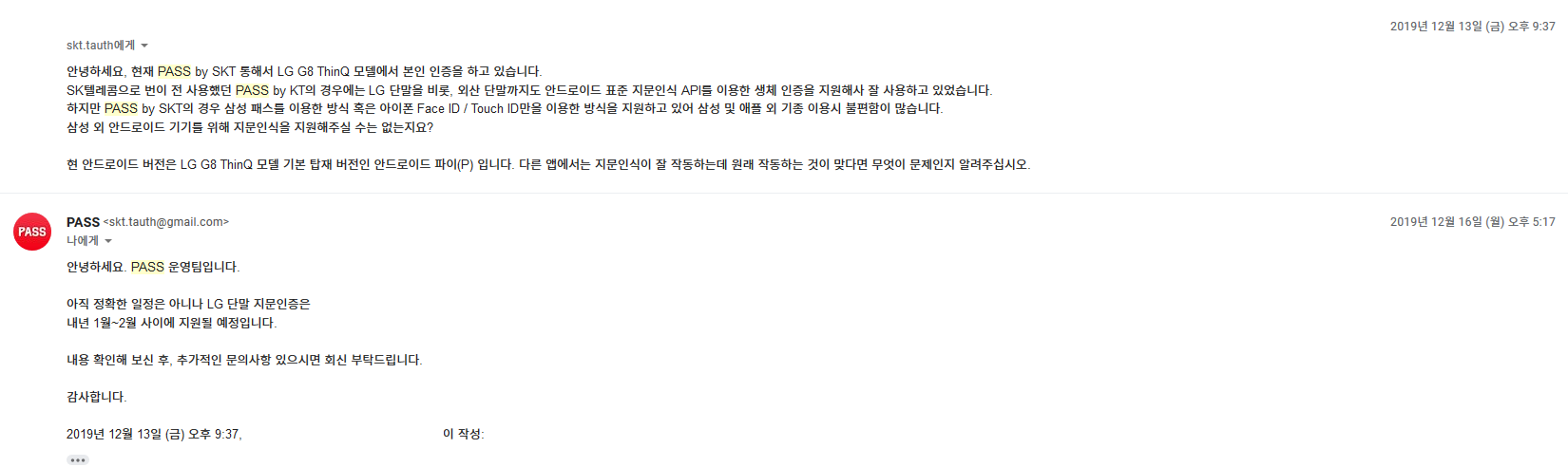 그러나 2월 8일 현재 업데이트는 다른 부분에 대해서만 이루어졌고 여전히 지문인증에 대한 변화는 없어 재문의하니 다음과 같은 답변을 얻을 수 있었습니다.