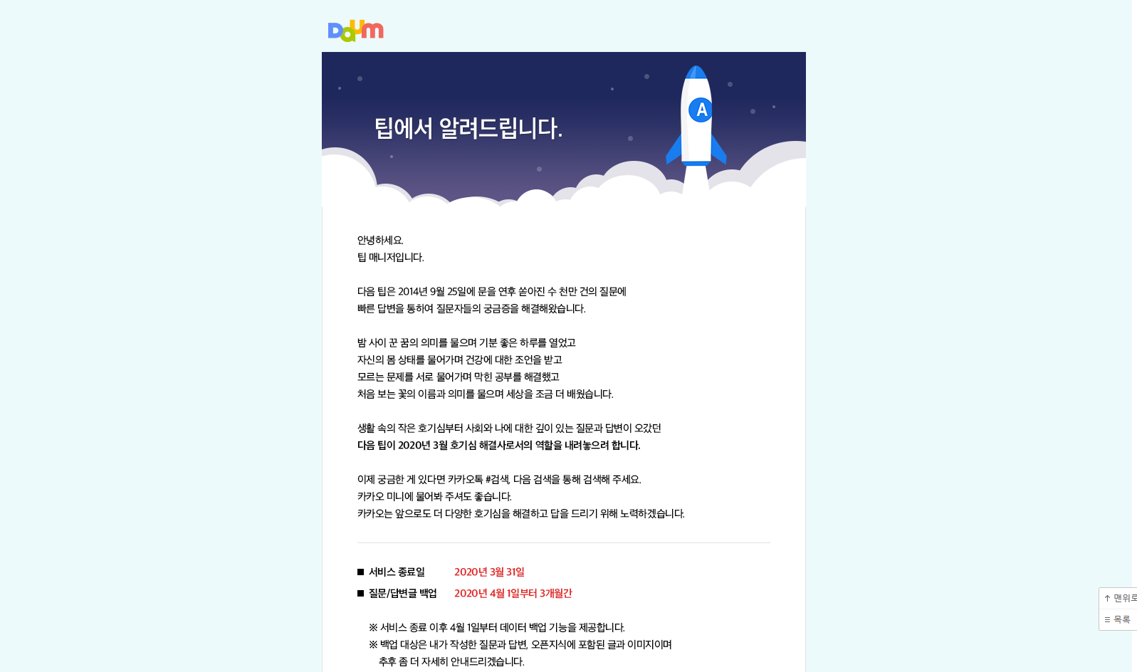 네이버 지식인과 비슷한 서비스인 다음 팁이 서비스 종료를 공지했습니다. 전신인 키워드 지존까지 합하면 약 15년 4개월, 다음 신지식부터 합하면 14년 3개월만에 그 역할을 내려놓는 것입니다.