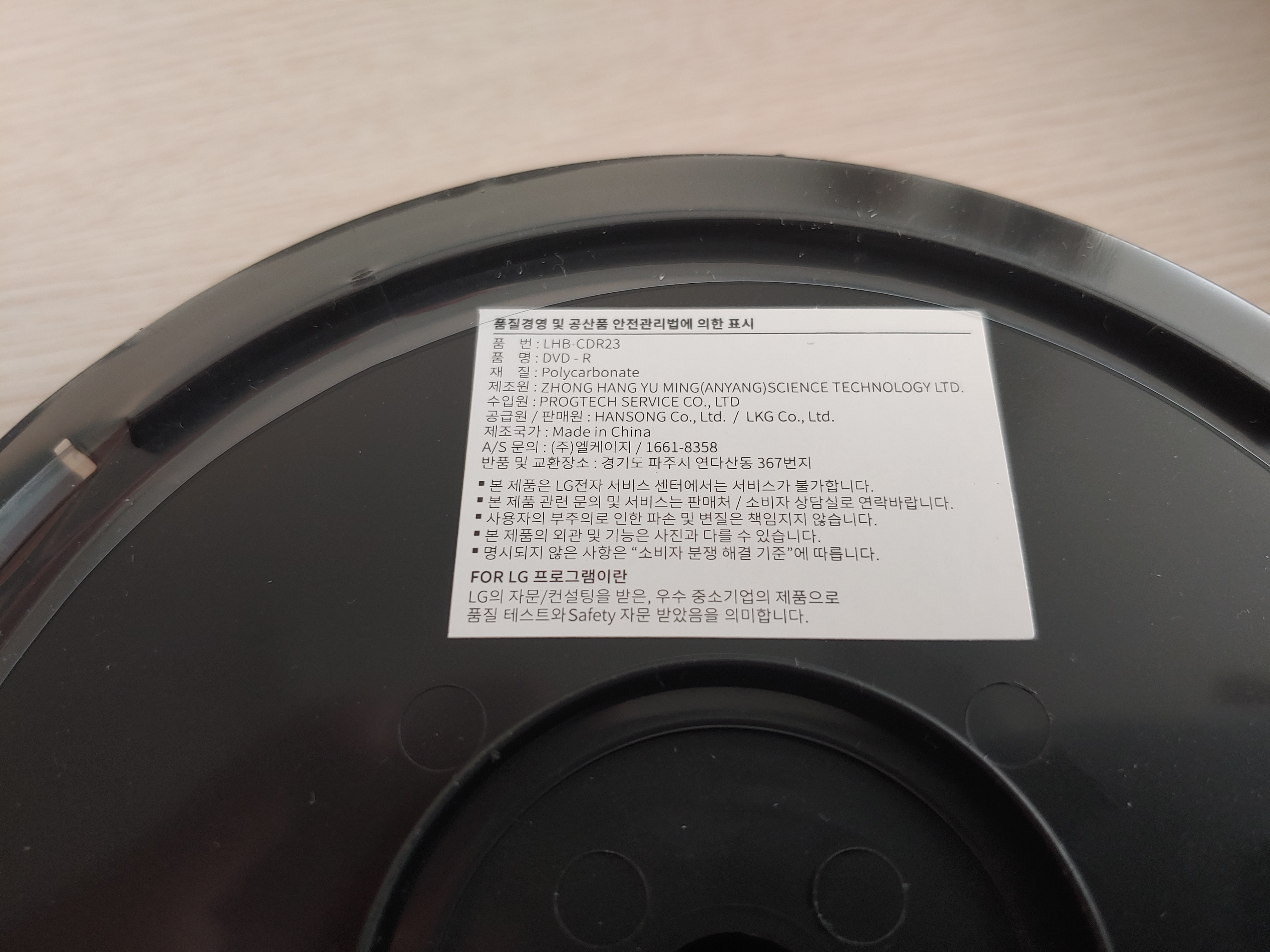 같이 받은 DVD-R 디스크는 LG가 아닌, 어느 중소기업에서 생산한 제품이었습니다. LG의 자문을 받았기 때문에 For LG라고 적어두었다는데, 개인적으로는 이 프로그램이 LG 이미지만 손상할 뿐더러 일부 비양심 판매자들이 LG 정품인 양 판매하고 있어서 없는 게 더 낫다는 입장입니다. 특히 현재도 그런지는 모르겠지만 LG는 자체적으로 DVD-R 제품을 생산했던 입장이라 더더욱 혼란을 가져올 수 있는 점에서 불만입니다.