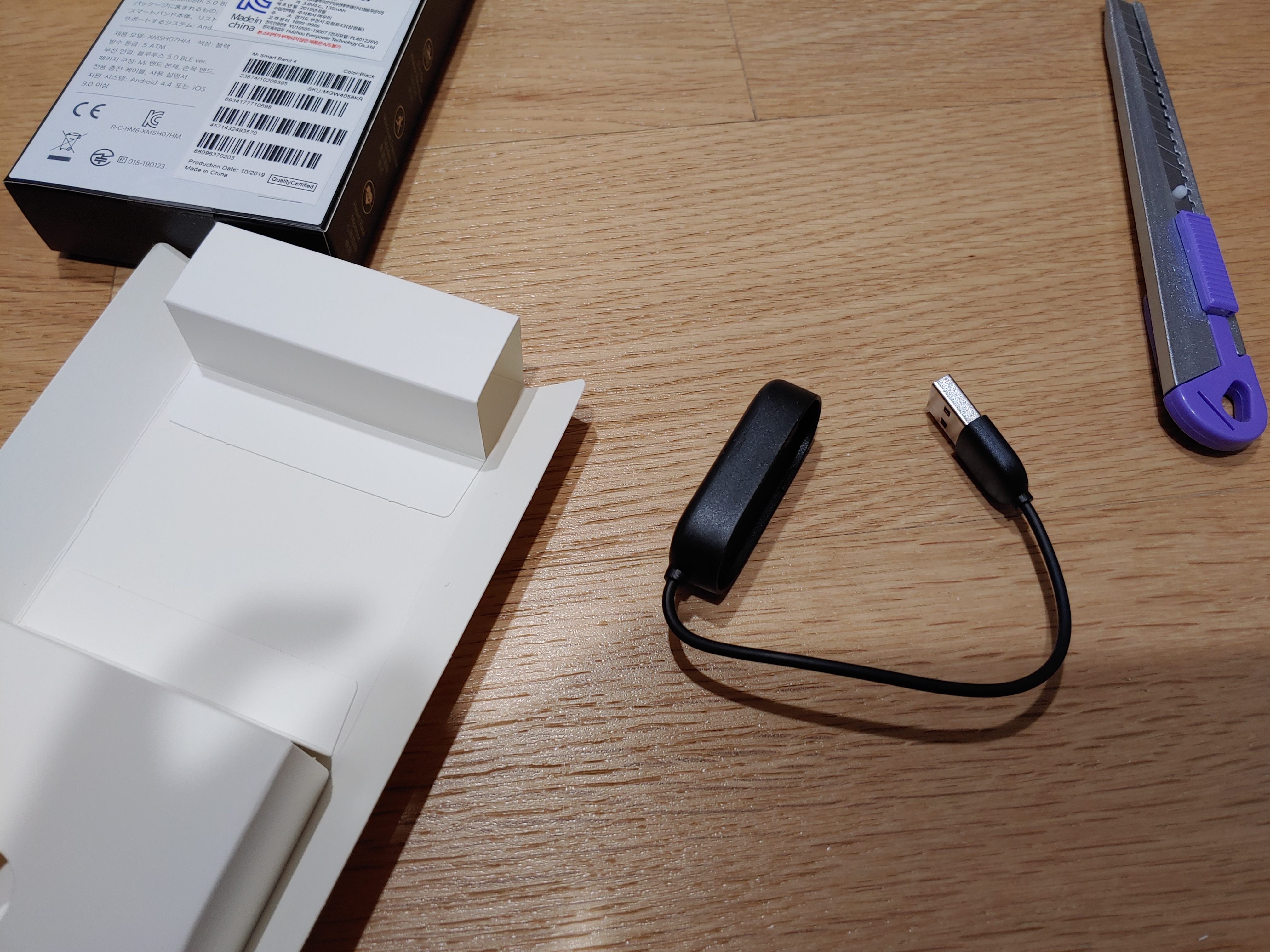 그 다음 구성품인 충전기는 본체를 밴드에서 빼낸 후 연결하는 방식입니다. 알리익스프레스 등지에서는 분리하지 않고 연결하는 방식의 충전기를 판매한다고 하는데 이 방법은 경우에 따라 충전이 잘 되지 않는 경우도 있다고 하여 당분간은 별도로 구입하지 않을 생각입니다.
