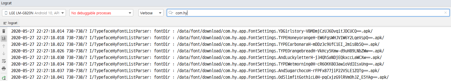 그래서 네이버 앱이 뱉는(?) 로그캣을 뜯어보기로 했습니다. 글꼴 변경 메뉴가 있으니, 글꼴을 읽어들이는 과정에서 혹시라도 로그를 보낸다면, 그리고 거기에 폴더 정보가 있다면 분명 읽어낼 수 있을 것이라 생각했기 때문입니다.