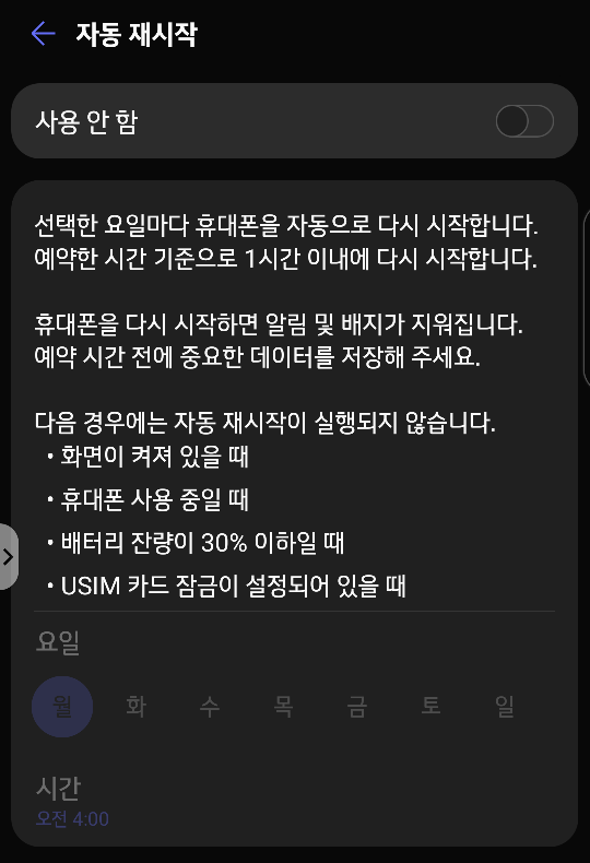 이번에 변경된 사항은 SKT 탑재 모델처럼 요일별로 재부팅 기능을 활성화할지를 결정할 수 있게 변경되었다는 점입니다. 벨벳이 아닌 G8 SKT 기종의 경우 요일별 설정이 있음에도 불구하고 제대로 작동하지 않는 버그가 있는데, 일단 현재까지는 벨벳에서 그런 버그를 발견하지는 못했습니다.