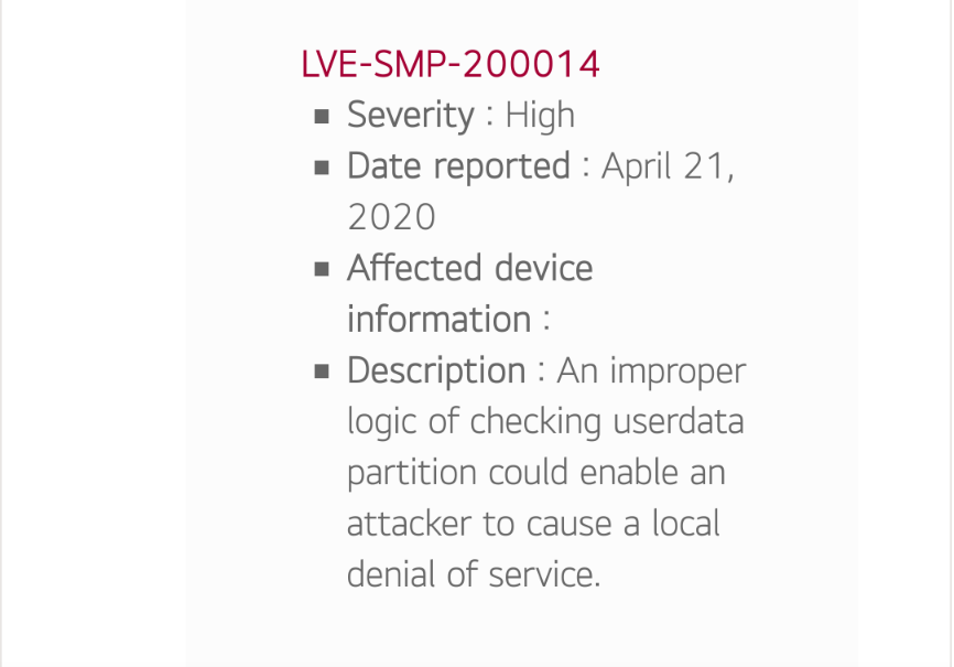 이번 6월 업데이트에는 Android 자체 취약점 이외에도, LG전자 프레임워크가 가지고 있는 취약점도 해결되었습니다. LVE-SMP-200014라는 이름을 가졌으며, 중요도가 높은 중대 취약점 중 하나입니다. 사용자 데이터 파티션을 확인하는 잘못된 작업을 이용해 공격자가 로컬 서비스 거부를 발생시킨다고 하네요.