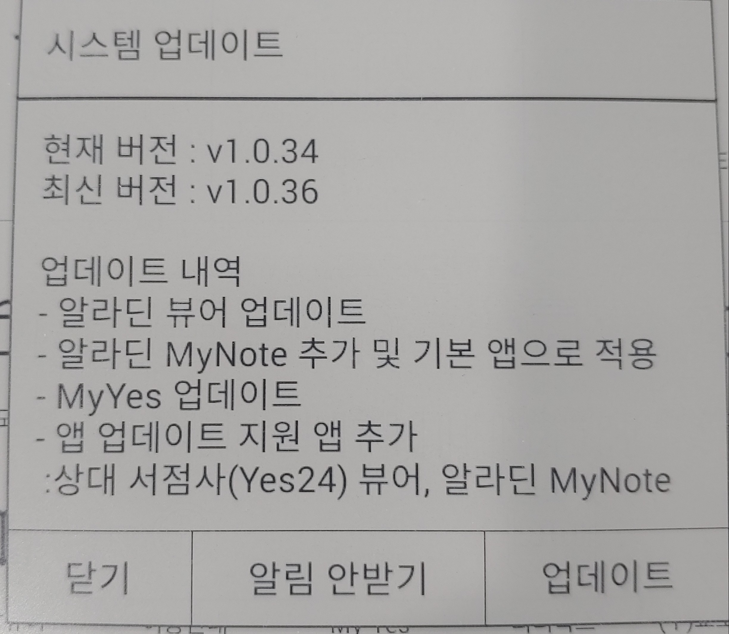 위 업데이트된 내역 이외에는 변경 사항이 없으나, 알라딘 MyNote는 기존 통합 뷰어 MyNote와는 약간 다른 UI를 가지고 있습니다.