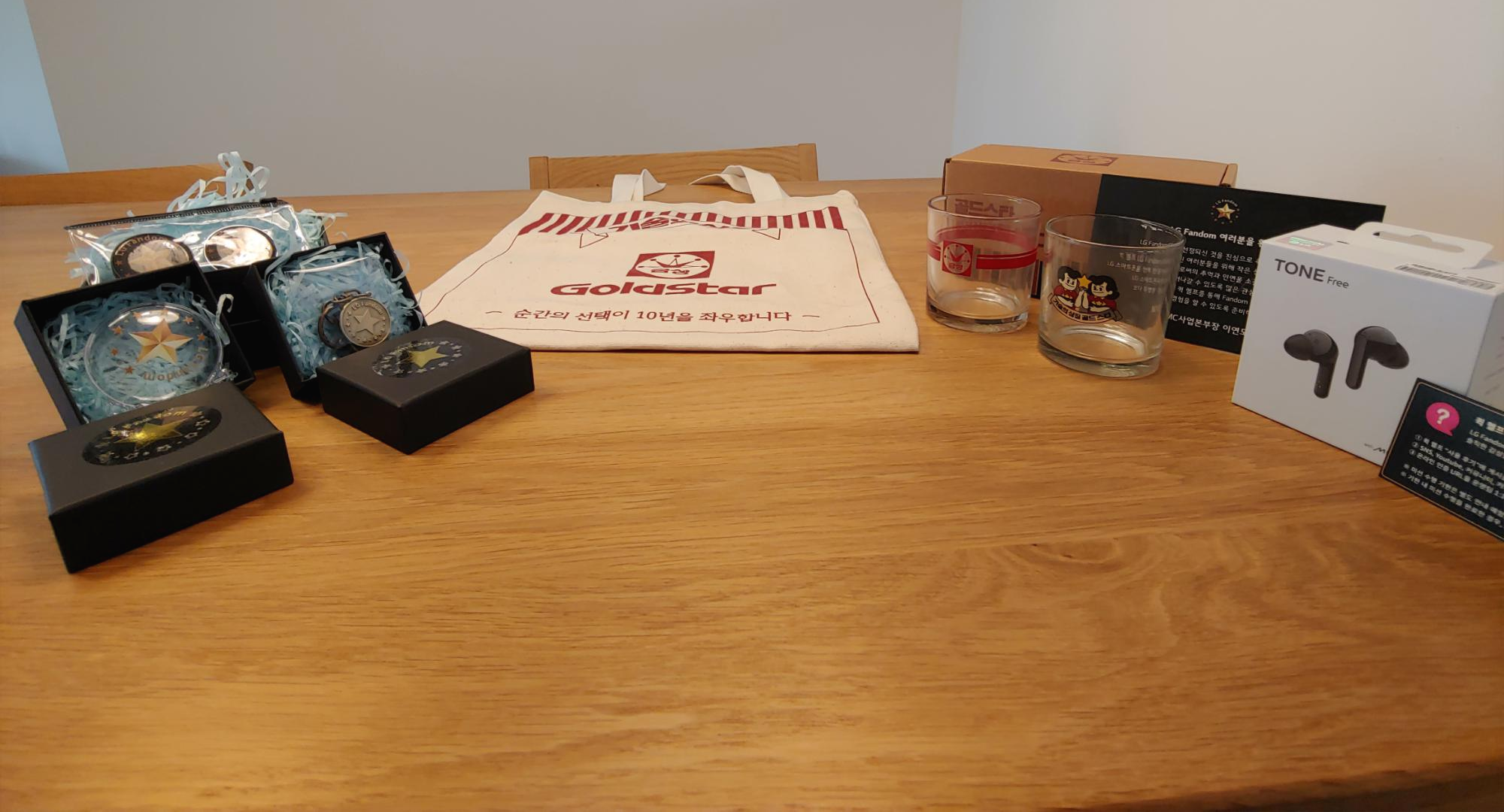 모집 페이지부터 자리한 7개의 별은 Fandom의 상징이 되어 굿즈에도 적용되었습니다. 전용 톤프리 케이스와 그 케이스에 달면 딱 좋을 것 같은 키링이 제공되었는데, 특히 키링이 고급진 색상인 게 마음에 들었어요. 뒤편으로는 작은 그립톡도 2종 배치해서 사진을 찍었는데 이 구도에선 잘 안 보이네요. 😅 나름 그립톡도 마음에 드는 디자인이었습니다. 처음에 냉장고 자석으로 오해했던 것만 빼면요.