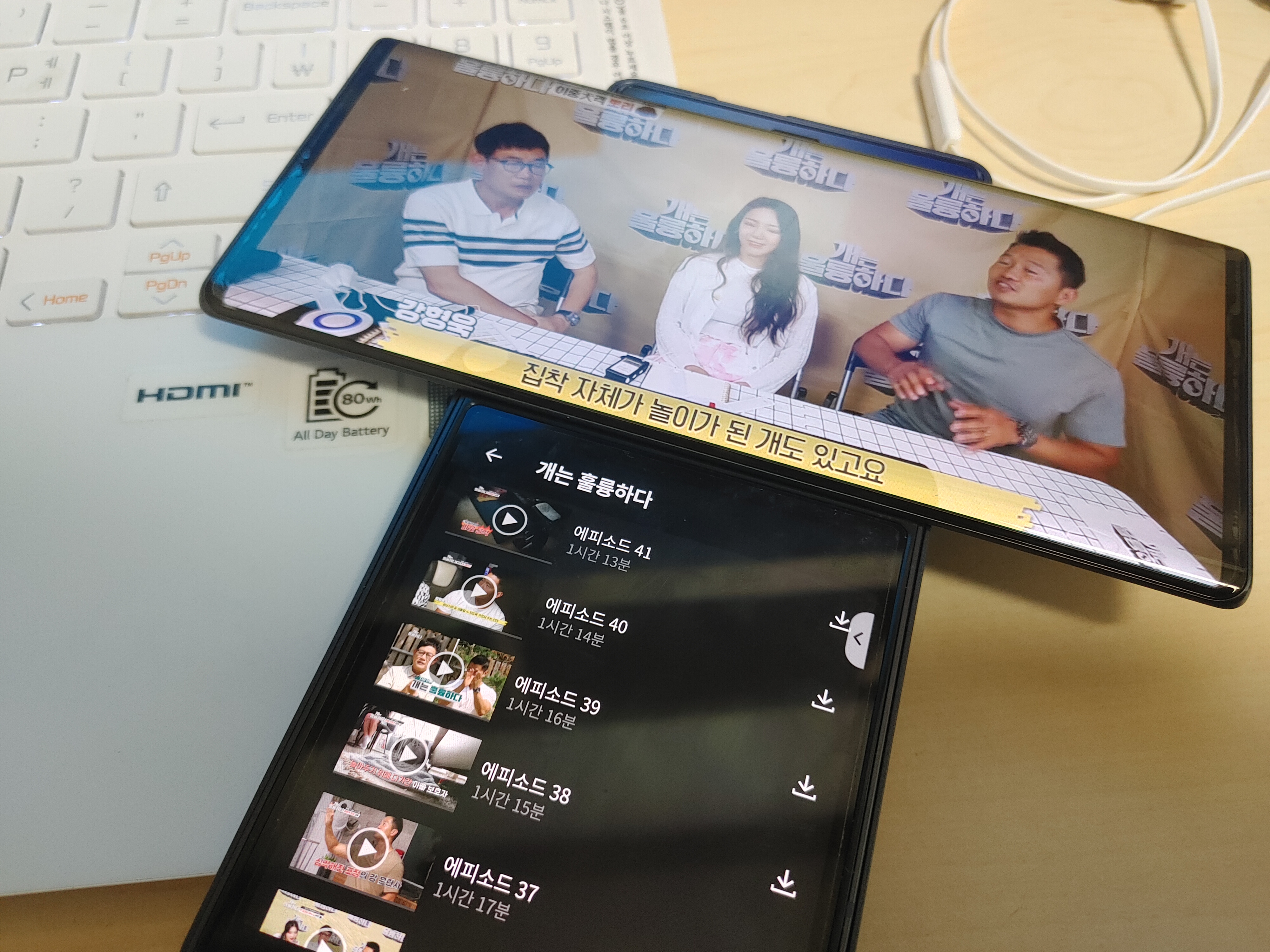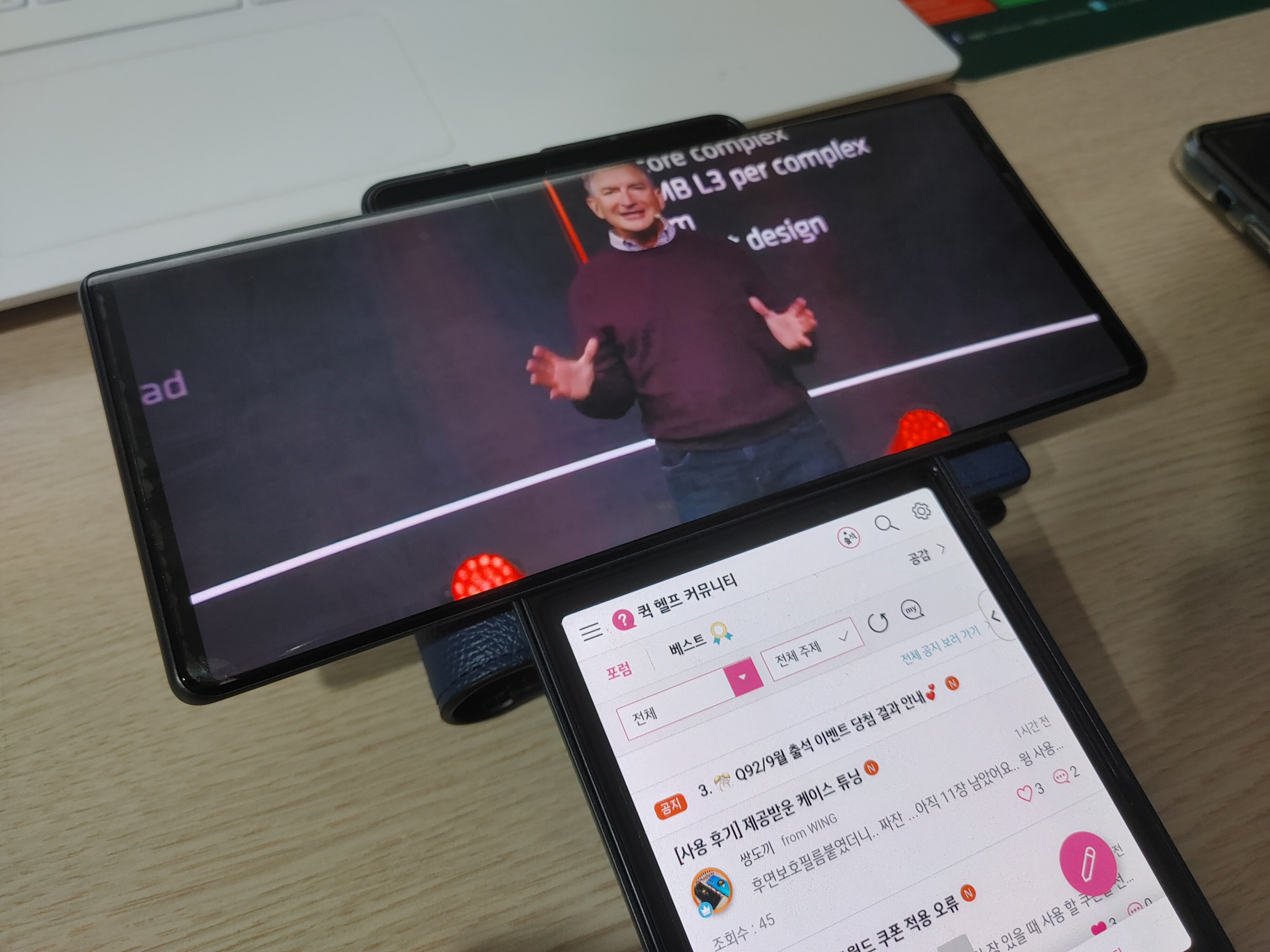 이렇게 ㅜ 모양으로 사용하는 것 외에도 ㅏ 모양으로 사용하는 것도 편했는데요, 한쪽에는 커뮤니티 앱을 열어두고 옆에서 벅스 앱을 열어두면 세컨드 스크린의 앱은 가로모드로 인식되어서 앨범아트를 비롯, 모든 제어 기능을 온전히 사용할 수 있어서 굳이 미디어 컨트롤러가 필요 없을 정도였습니다.