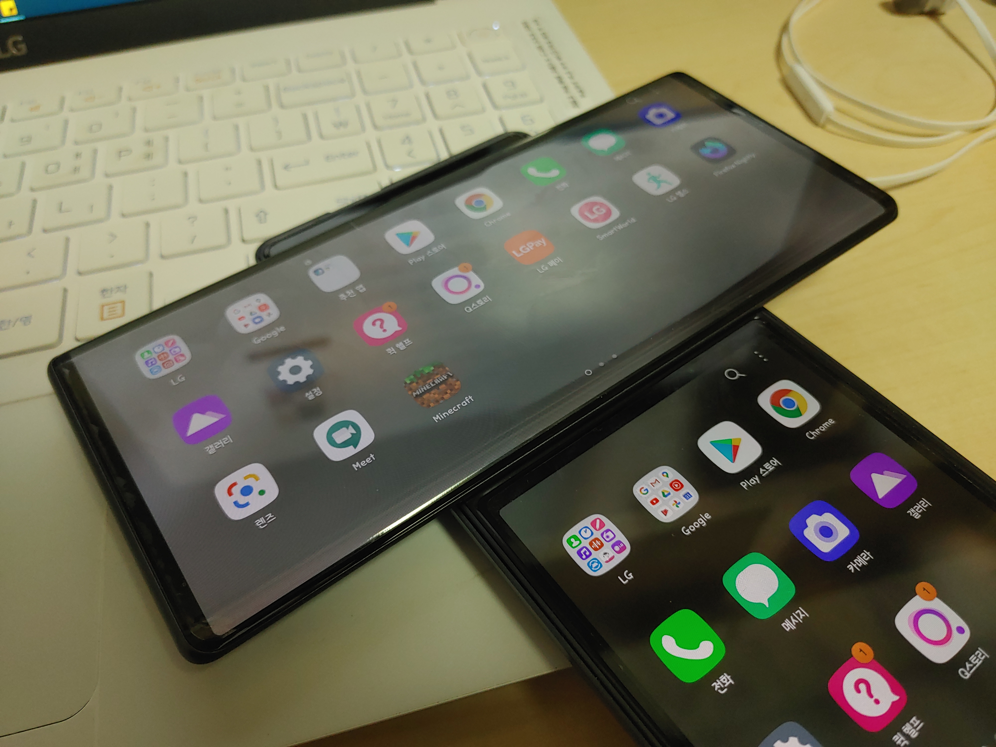 그리고 메인 스크린을 터치해야 '완료'되는 몇몇 게임, 앱들에서 생각보다 편하지 않음을 토로하시는 분들도 종종 계신데, 그렇다고는 해도 세컨드 스크린에서 사용하는 키보드의 크키가 세로모드에서 사용하는 그것과 거의 비슷한 관계로 일반 바형 스마트폰보다는 빠른 속도로, 오타율을 낮춘 상태로 사용할 수 있었습니다. 팝업 키보드와는 조금 다른 것이, 물리적으로도 작다보니 손을 무리하게 뻗을 필요가 없더군요. 같은 이유로 키보드를 자주 사용해야 하는 오피스 앱(한컴오피스, MS 오피스, 폴라리스 오피스, WPS 오피스 등)에서도 가로모드에서 문서를 좀 더 크게 보면서 키보드에 방해받지 않고 문서 작성이 가능하여 LG가 이런 앱들과 제휴하여 각종 메뉴를 세컨드 스크린에 띄우는 방식으로 활용성을 높이면 어땠을까 싶은 생각도 순간 들었습니다.