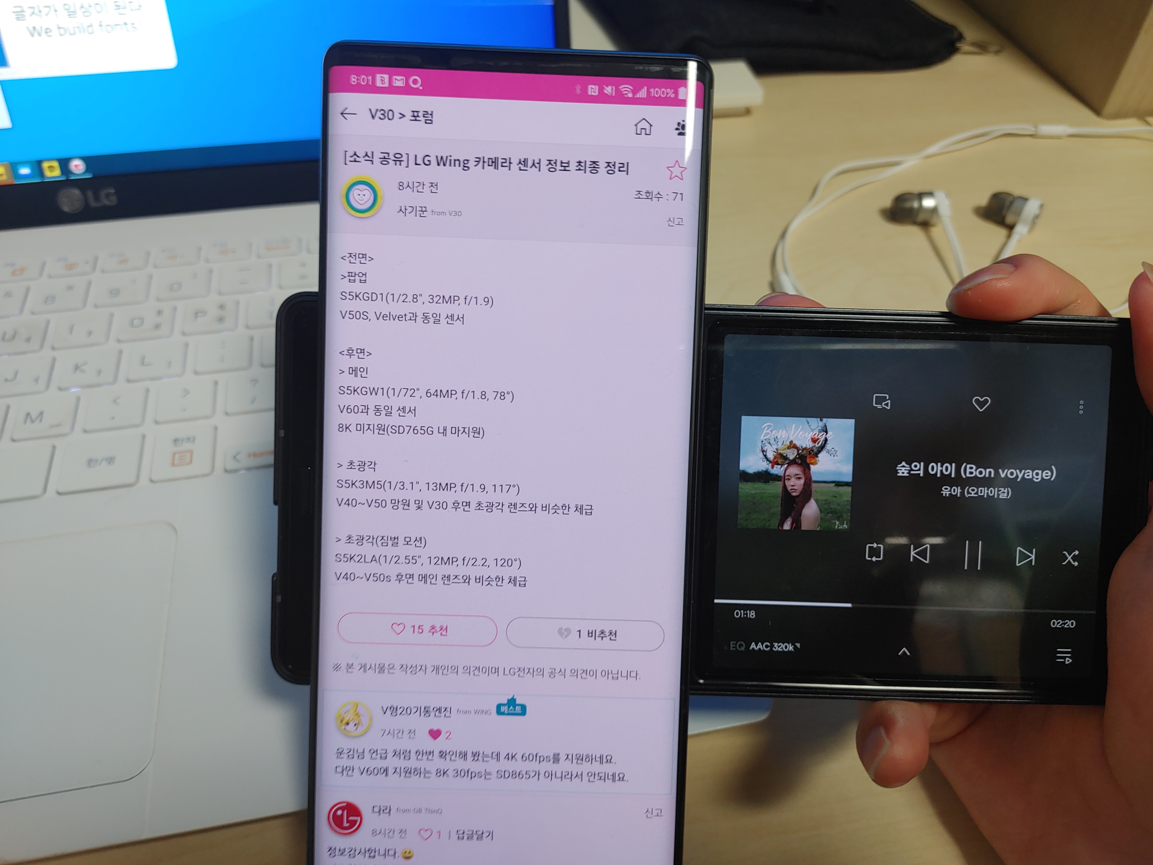 이렇게 ㅜ 모양으로 사용하는 것 외에도 ㅏ 모양으로 사용하는 것도 편했는데요, 한쪽에는 커뮤니티 앱을 열어두고 옆에서 벅스 앱을 열어두면 세컨드 스크린의 앱은 가로모드로 인식되어서 앨범아트를 비롯, 모든 제어 기능을 온전히 사용할 수 있어서 굳이 미디어 컨트롤러가 필요 없을 정도였습니다.