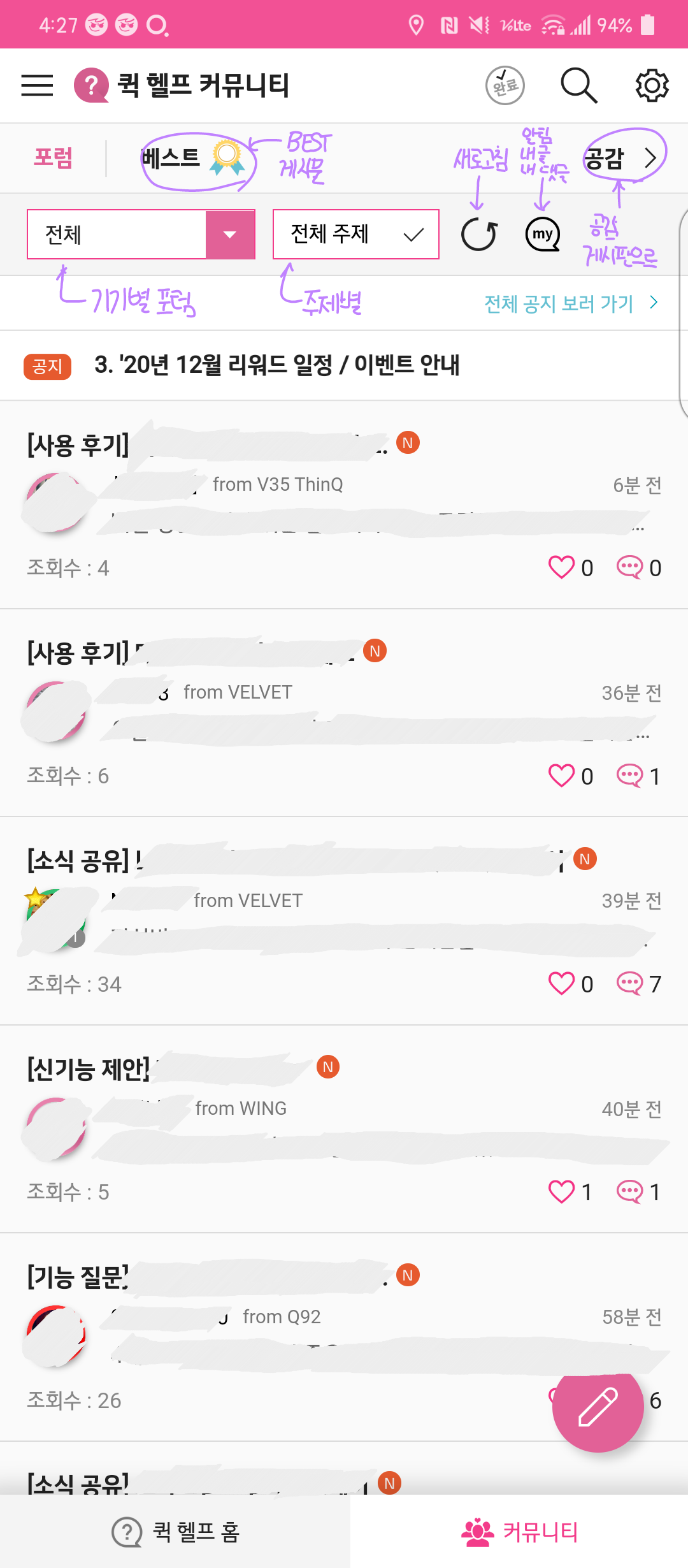 퀵 헬프 커뮤니티는 LG전자가 주최하는 이벤트를 비롯해 다양한 LG전자 스마트폰 사용자를 만날 수 있는 공간입니다. 글 및 댓글, 추천 제도를 통해 글을 작성할 수 있으며 퀵 헬프의 포인트 제도는 커뮤니티 기능을 통해서 얻는다고 해도 과언이 아니라고 할 정도로 커뮤니티의 기능적인 중요도는 높은 편입니다.