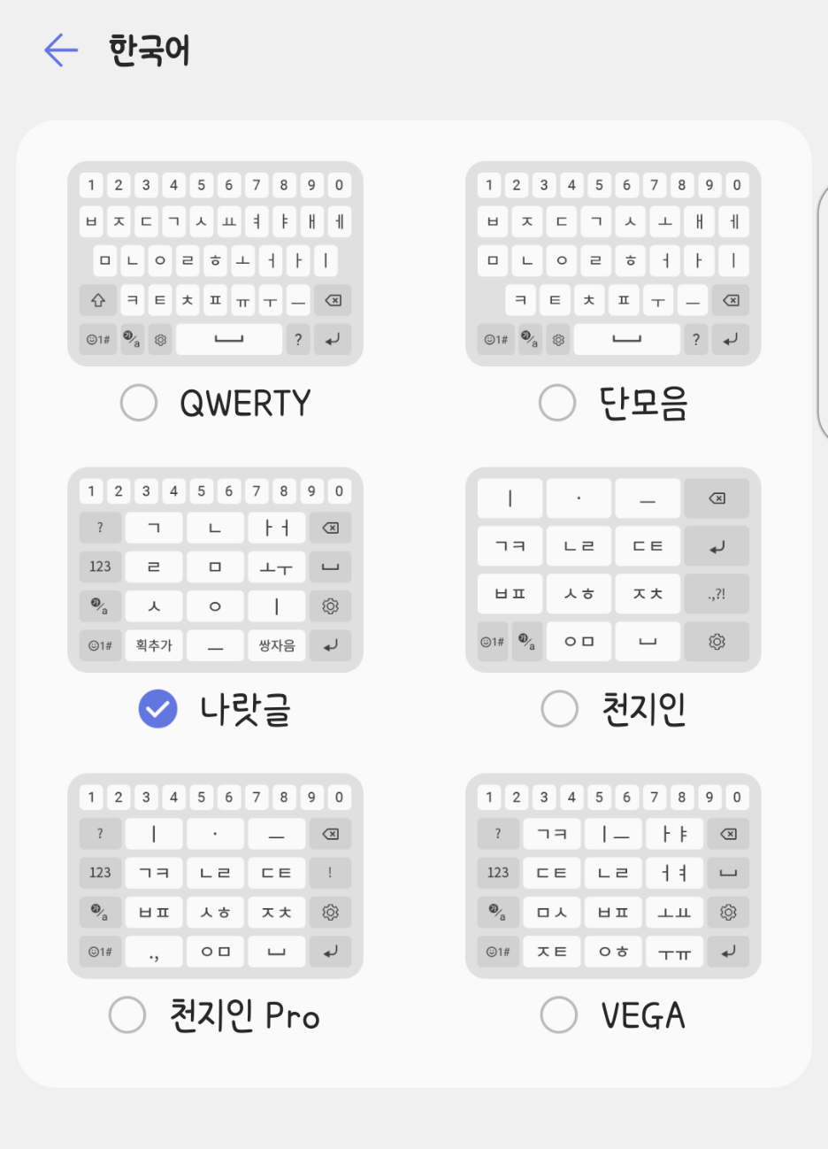 에서 배열을 변경할 수 있습니다. 2020년 12월 기준, 한국어는 'QWERTY, 단모음, 나랏글, 천지인, 천지인 Pro, VEGA' 레이아웃을 제공하며 영어는 'QWERTY 키보드' 및 '폰 키보드[각주:4]'를 지원합니다.