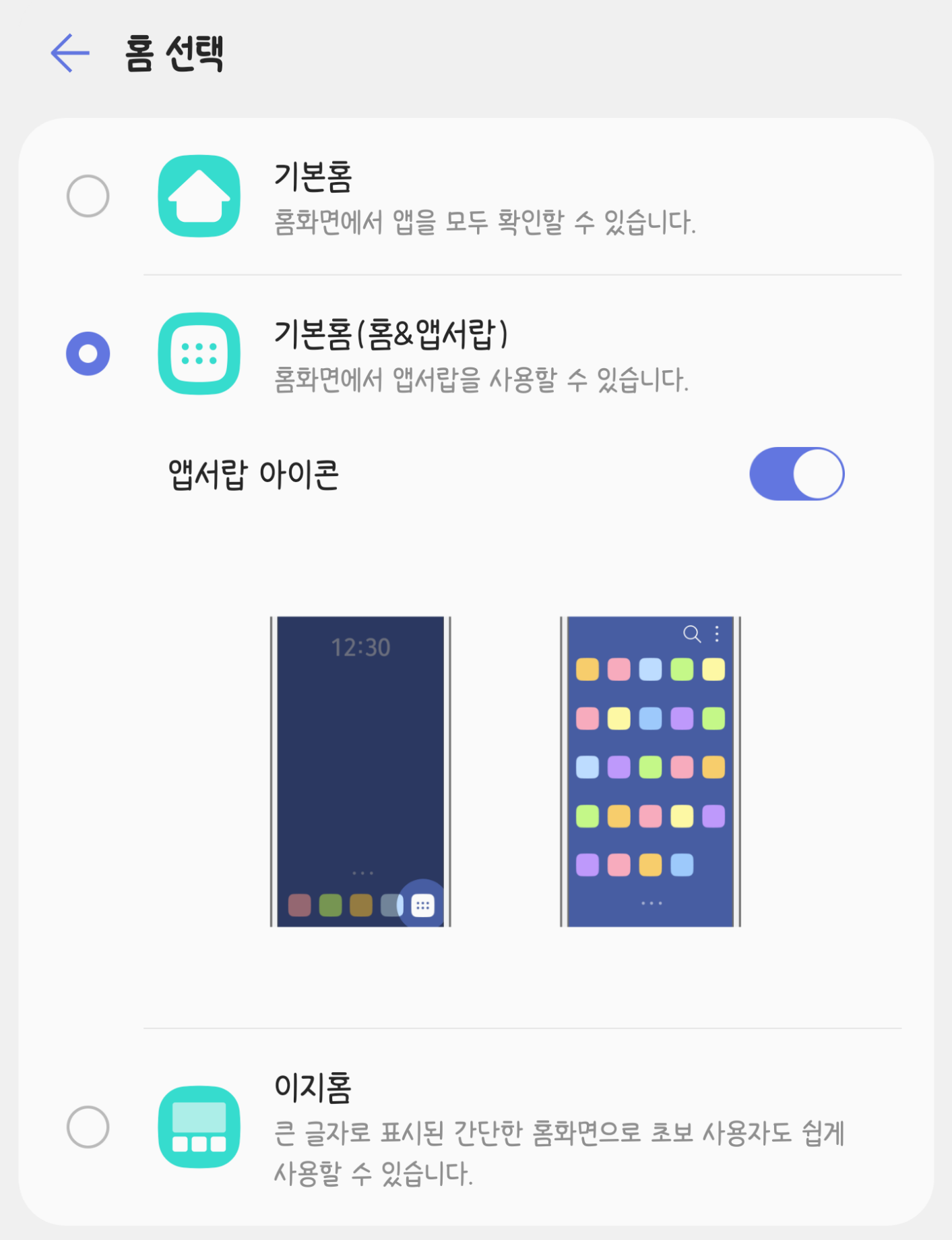 기본적으로 처음 스마트폰 설정 시 나타나는 화면인 '환영합니다'를 누르면 선택할 수 있는 분야 중의 하나가 '홈 선택'일 것입니다. 전통적인 스타일의, 앱 서랍이 따로 있는 형태인 홈은 '기본홈(홈&앱서랍)'을 선택하시면 되는데요, 설정 > 화면 > 홈 화면 > 홈 선택에서 설정 가능합니다.