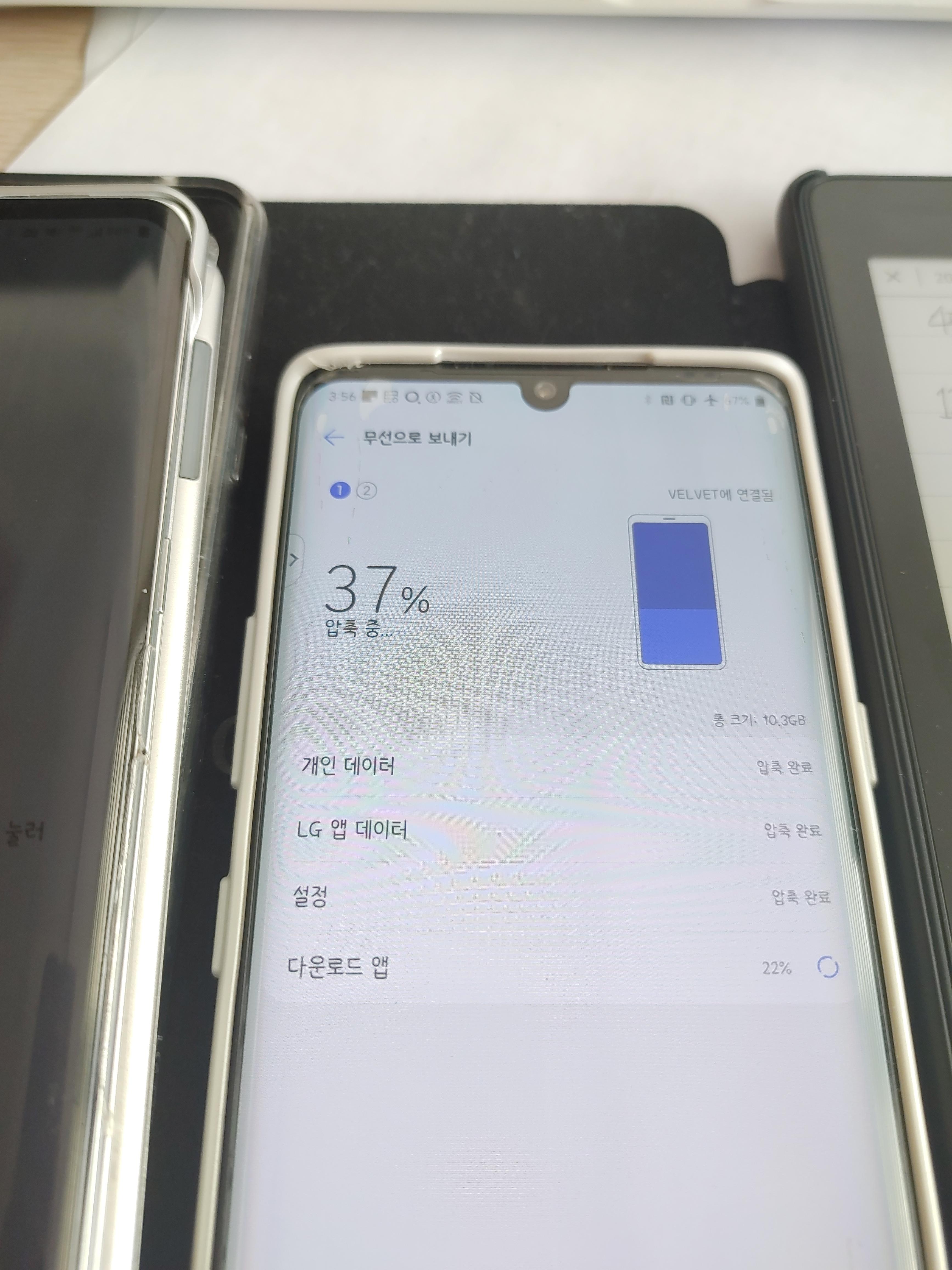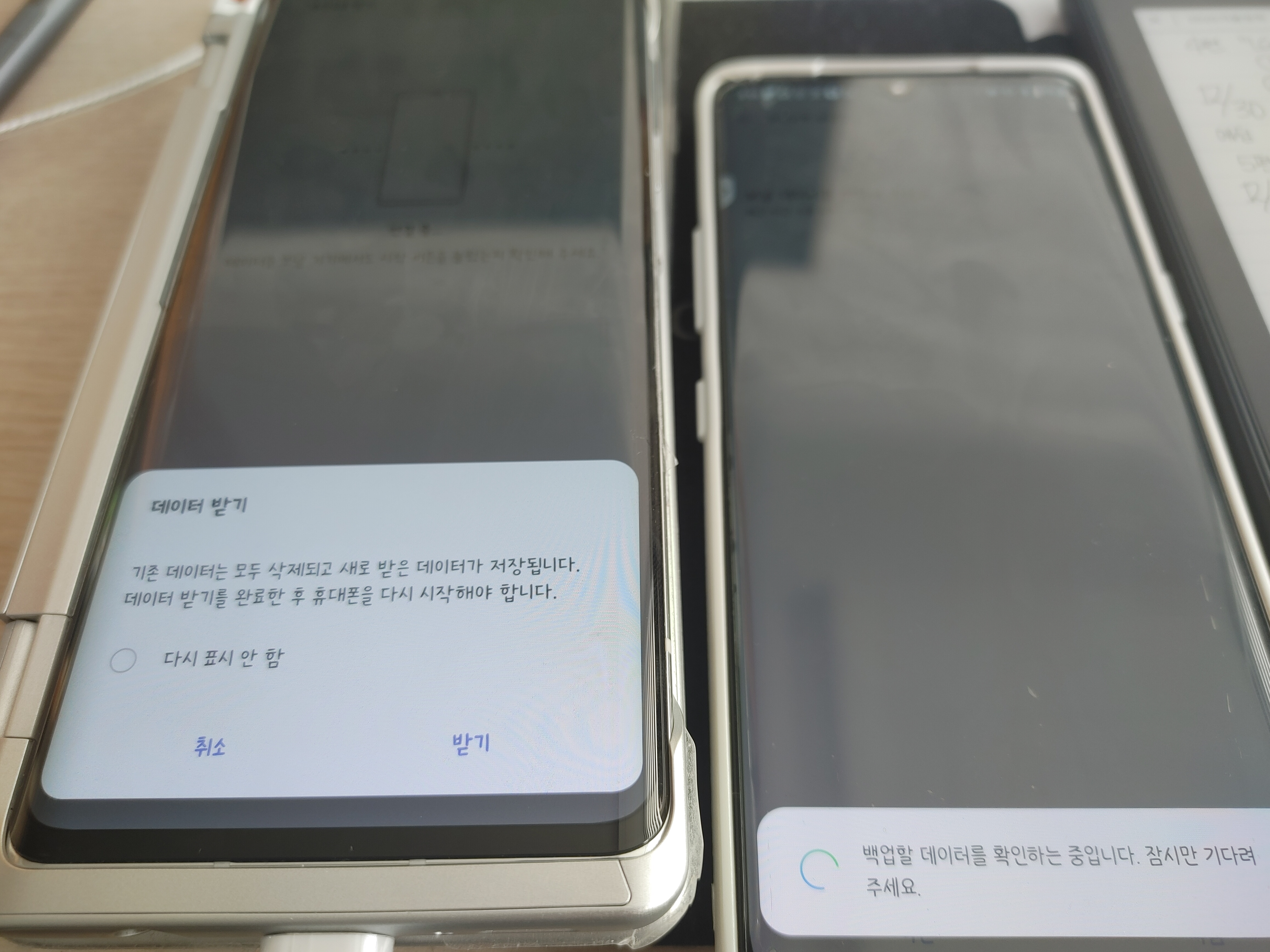 압축이 끝나면 전송 절차가 시작되며 이 시간동안 휴대폰은 사용할 수 없습니다. 복원이 끝나면 최적화를 위해 다시 시작 절차도 필요하므로, 최소한 받는 휴대폰은 데이터를 받기 전에 미리 해야할 일을 모두 마치시기를 권장드립니다.