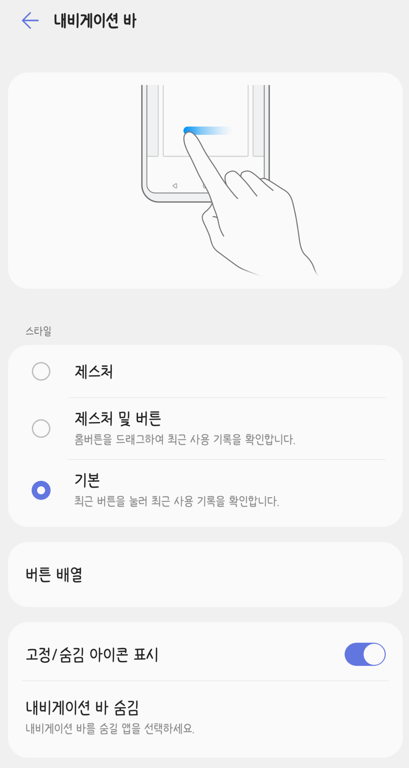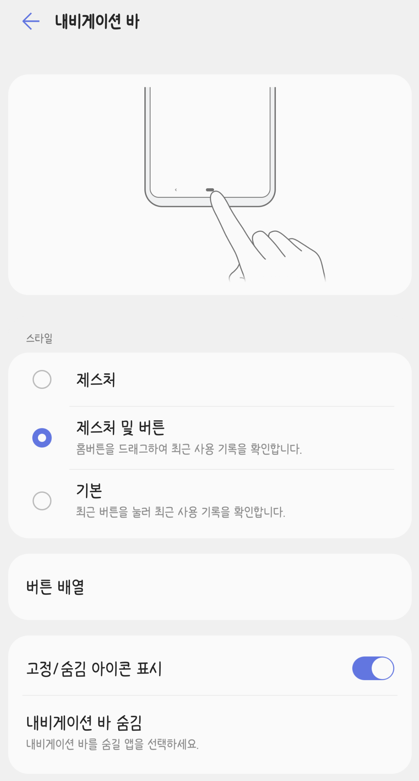 다행히 기종을 가리지 않고 공통적으로 설정 > 화면 > 내비게이션 바에서 설정 가능합니다.
