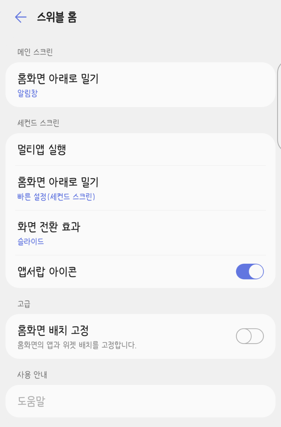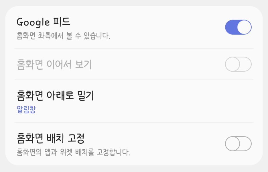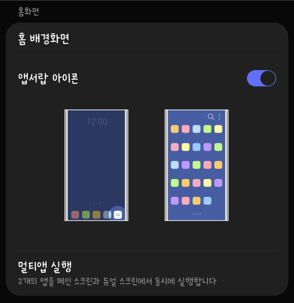 이때 앱 서랍의 경우 서랍으로 접근하는 아이콘을 제거하여 더 많은 앱을 배치하는 식으로 변경할 수 있게 토글이 제공되는 것이 특징입니다. 따라서 만약 앱서랍 형태의 홈화면으로 설정을 변경하였는데도 접근하는 방법이 보이지 않는다면 홈 화면에서 위로 쓸어올려보세요.