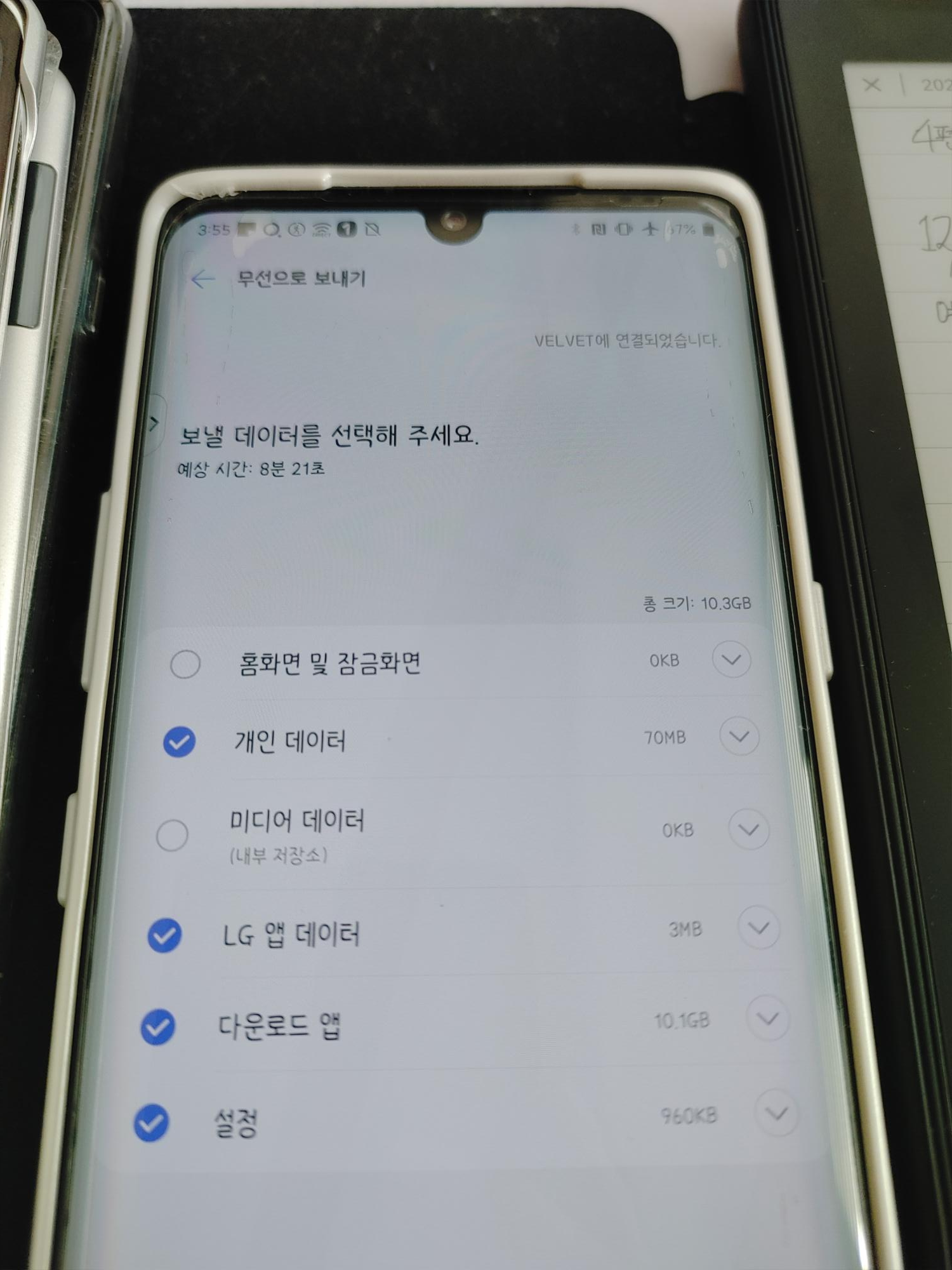 이렇게 보내는 작업은 자동 백업 및 수동 백업과 동일한 절차를 거쳐, 보내고 받는 과정이 추가됩니다. 따라서 위 사진처럼 '보낼 데이터를 선택'하는 화면이 나타나게 되는데요, 이 중 '미디어 데이터'는 보내지 않는 것을 추천드립니다. 그 이유는 파일 크기가 방대할 뿐더러 압축하는 과정에서 그냥 보내는 것보다 시간이 더 오래 걸리고 실패 확률도 높아지기 때문입니다. 같은 이유로 실패 확률 및 데이터가 꼬일 확률이 높은 다운로드 앱 항목도 보내지 않을 것을 추천드립니다.