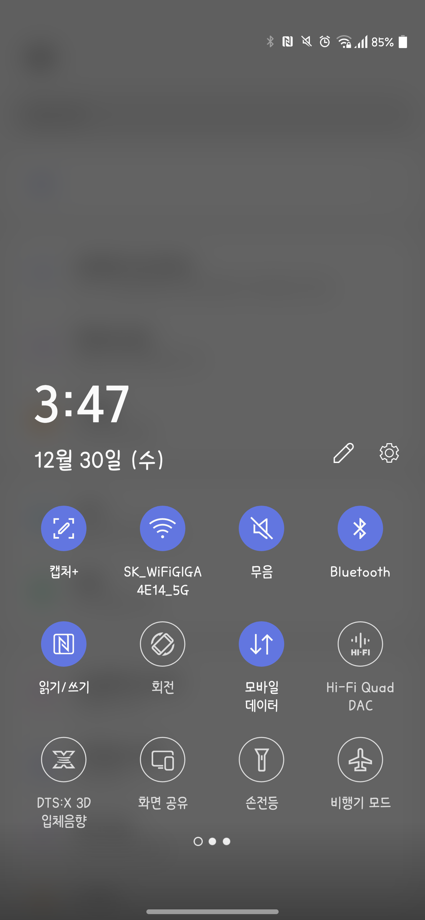 빠른 설정은 마찬가지로 '연필 모양 아이콘'을 클릭해서 수정할 수 있는데요, 버튼을 눌렀을 때 위에 배치된 항목들이 빠른 설정에 없는 항목들이고 아래 배치된 항목들이 기존에 배치된 항목을 뜻합니다. 위는 스크롤 형태로 구성되어 있고 아래는 페이지 형태로 구성되어 있으므로, 배치하려는 항목이 보이지 않을 경우에는 스크롤해보시는 것을 추천드립니다.