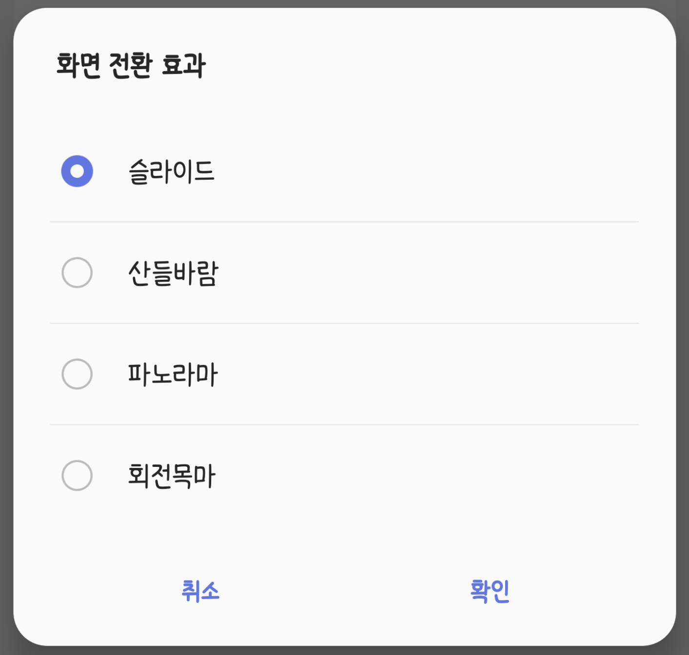 그 외에 공통적으로 제공하는 방식으로는 '아이콘 모양'과 '화면 전환 효과'가 있습니다. 화면 전환 효과는 예전부터 제공되던 기능으로 화면을 다음 페이지로 넘길 때 발생하는 애니메이션 효과를 설정하는 메뉴입니다. 현재는 4가지 효과를 지원하고 있으며 신형 기종과 구형 기종은 메뉴가 '팝업' 형태이냐, 아니면 별도 페이지로 넘어가느냐 정도의 차이만 있습니다.