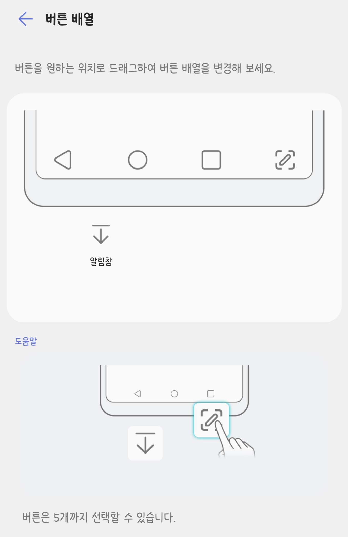 - 기본: 뒤로가기 / 홈 / 멀티태스킹 버튼의 순서 변경 및 '알림창 내리기', '캡처+' 바로가기 키 배치 가능