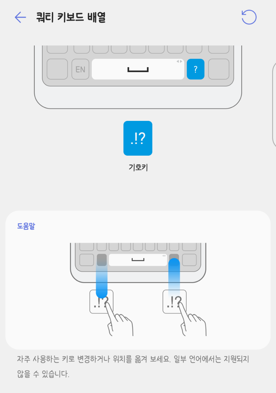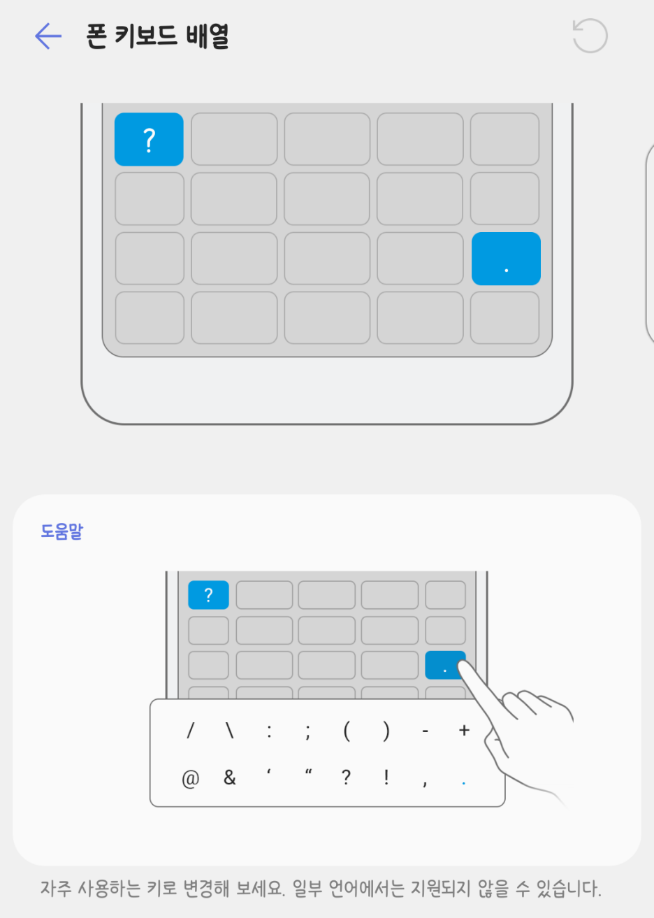 만약 나랏글, 천지인, 천지인 Pro, VEGA 혹은 (영어에서의) '폰 키보드'를 사용 중이라면 기호 키를 한 번 눌렀을 때 입력될 기호를 16개 중 하나로 선택할 수 있습니다. 기본값은 물음표(?)와 온점(.)이며 '폰 키보드'는 키를 뺄 수 없는 것이 특징입니다.