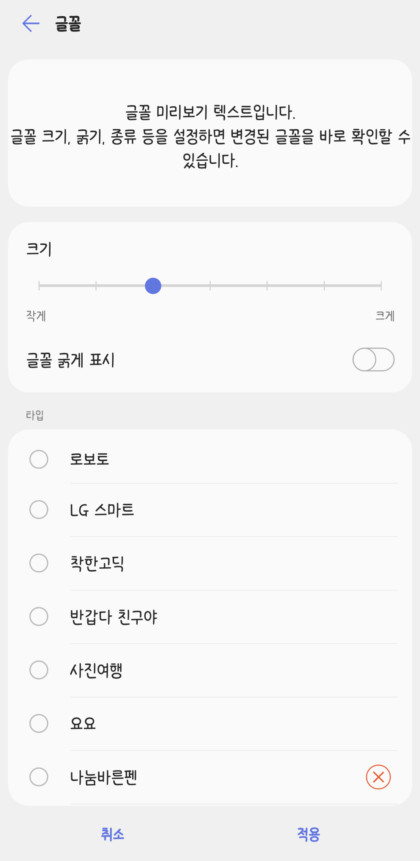 기본 (한글: LG 스마트 UI, 그 외: Roboto) LG 스마트 UI 착한고딕 반갑다 친구야 사진여행 요요 중 택1, 기본값은 '기본' |