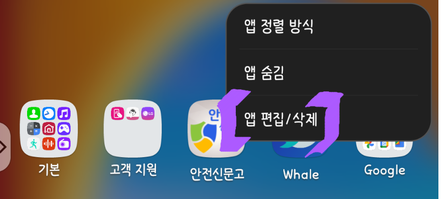 일반 홈화면은 그저 길게 눌러 옮기기만 하면 되지만, 앱서랍은 그렇지 않습니다. 따라서 별도 메뉴로 진입해야 하는데요, 위 사진의 맨 왼쪽 사진처럼 ...이 세로로 표시된 부분을 누르신 후, '앱 편집/삭제'를 선택, 이후 길게 눌러 폴더 안에 넣거나 다음 페이지로 앱 이동, 혹은 앱 제거가 가능합니다.