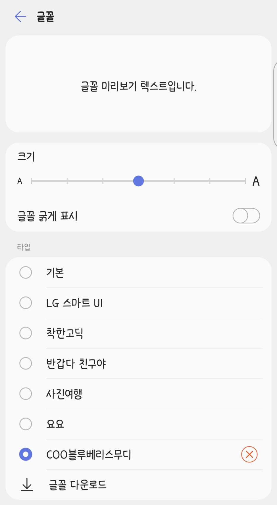 글꼴은 LG SmartWorld에서 설치한 글꼴 및 사전 탑재된 글꼴만 지원하며, 설정 > 화면 > 글꼴에서 설정 가능합니다. 이전에 LG SmartWorld에서 글꼴을 구입한 이력이 있다면 다른 기기에도 설치할 수 있으며 현재 해당 글꼴이 SmartWorld에서 내려간 경우에는 '기존 구입자'에 한해 SmartWorld > 마이페이지 > 콘텐츠 구매내역에서 확인 후 내려받을 수 있습니다.