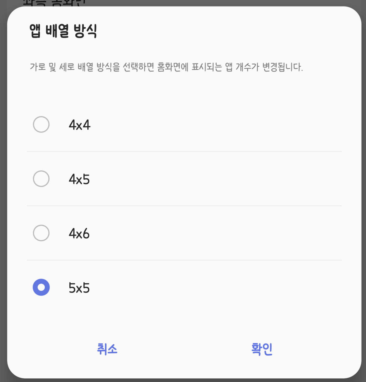 또한 앱 배열 방식을 4x4, 4x6, 4x5, 5x5로 설정 가능하여 좀 더 다양한 배치를 사용할 수 있는 것도 장점입니다.