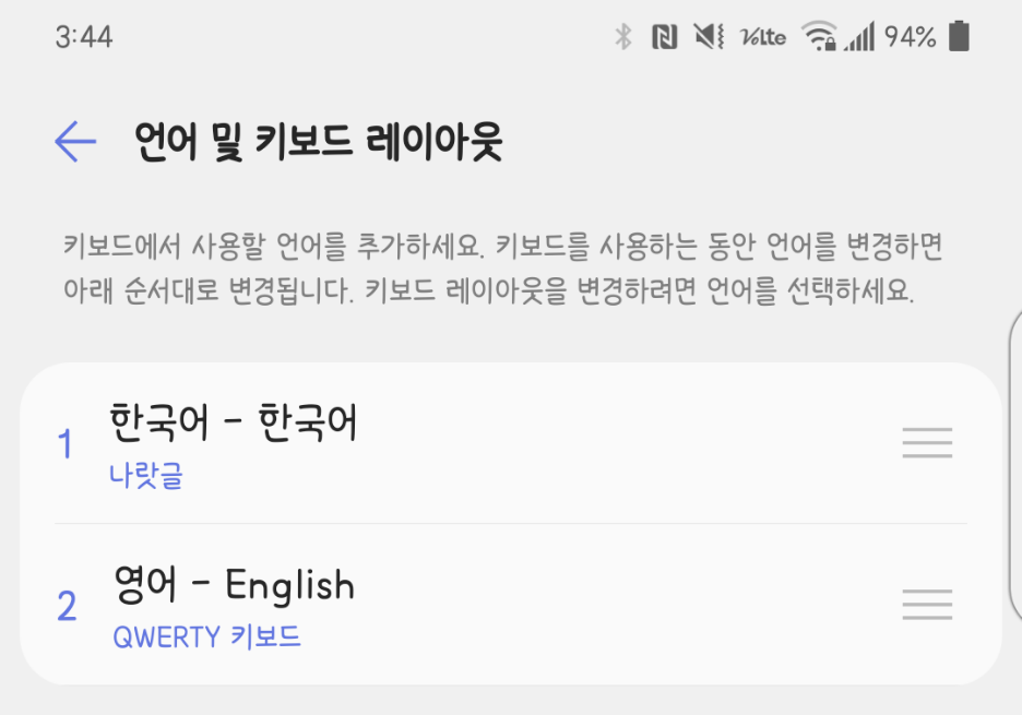- 설정 > 시스템 > 언어 및 키보드 > 키보드 관리 > LG 키보드 > 언어 및 키보드 레이아웃