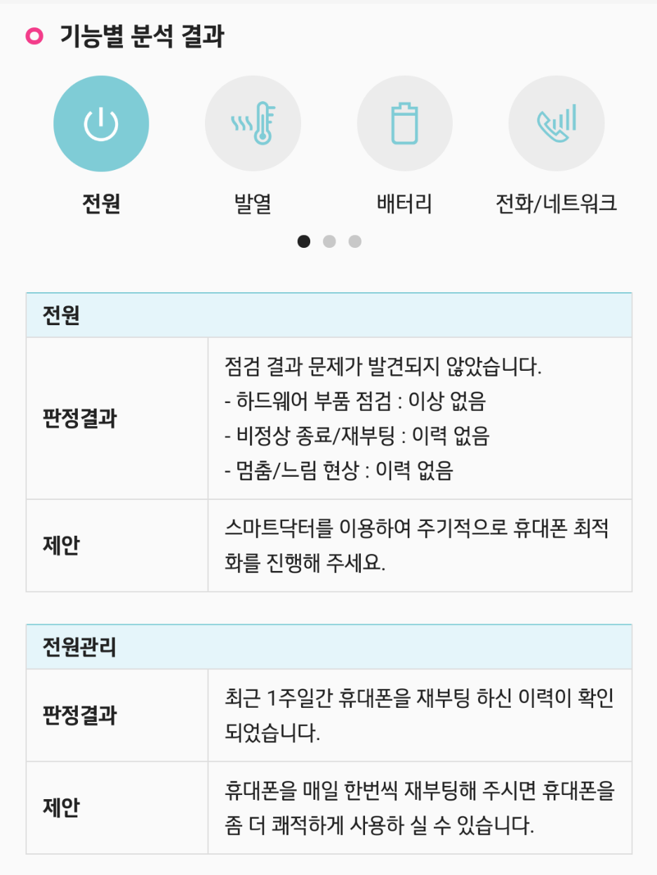그리고 기본적으로 '휴대폰 상태 진단'은 알림창에 그때그때 개선하면 좋은 부분들을 안내하기 때문에 굳이 들어갈 필요가 많지는 않은 항목이기도 합니다. 오히려 퀵헬프의 '휴대폰 자가 진단'이라는 유사 서비스가 일주일 통계 단위로 로그 분석하여 제공하는 내용으로 좀 더 내용도 풍부하고 LG 서비스센터와 동일 솔루션을 사용했기 때문에 유용하게 사용이 가능합니다.