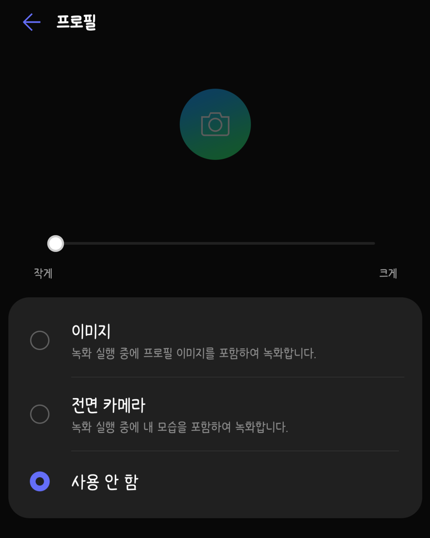 '화면 녹화' 기능은 알림창의 빠른 설정 란에서 시작할 수 있는데요, 단순히 화면을 녹화하는 기능만은 아닙니다. '프로필' 설정에서 워터마크를 겸해 특정 이미지를 특정 위치에 두고 녹화를 할 수도 있고, 전면 카메라를 켜고 동시에 녹화하여 스마트폰 리뷰 등에 사용할 수도 있습니다.[각주:3]물론, 아예 '프로필'을 설정하지 않을 수도 있습니다.