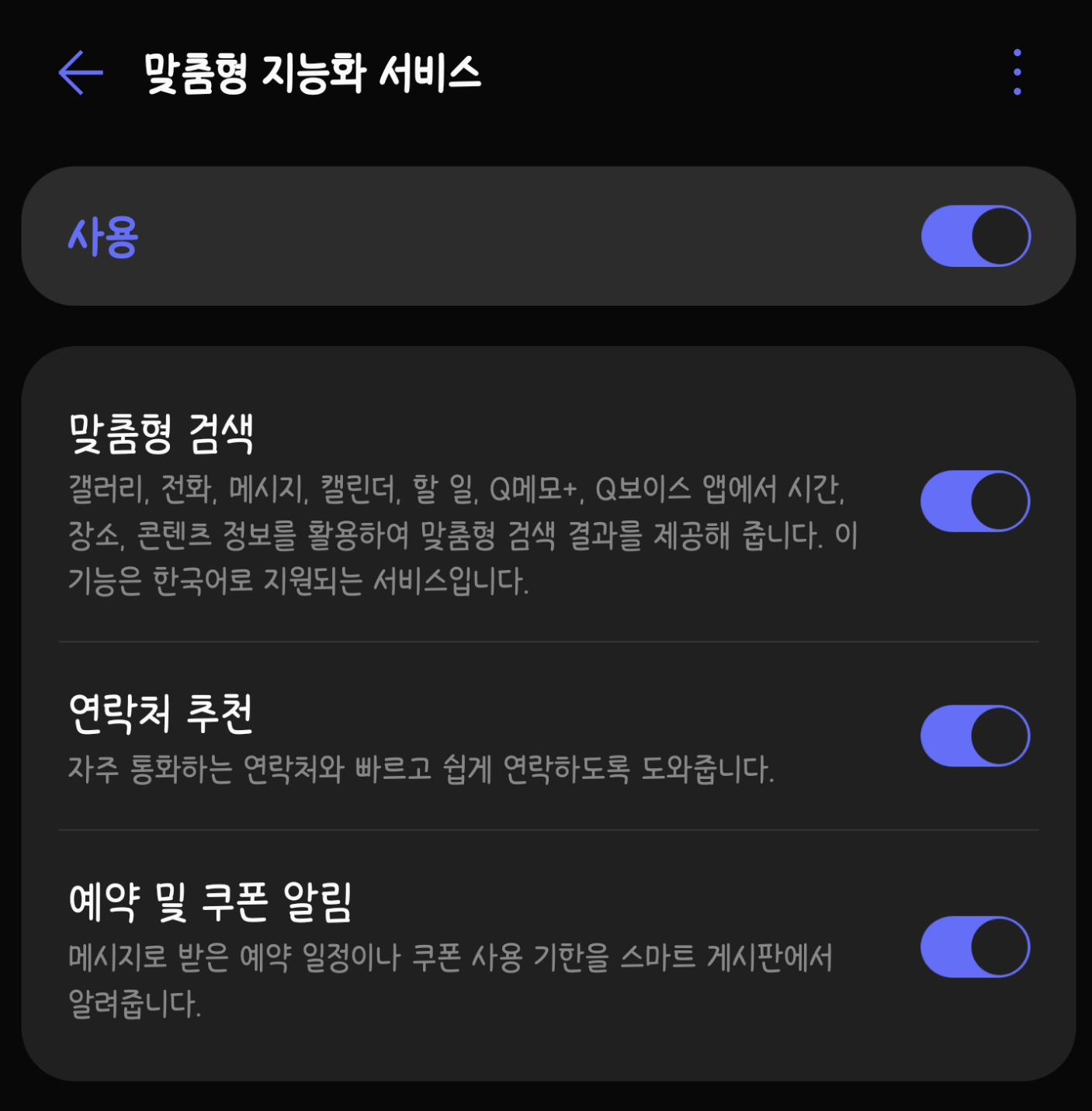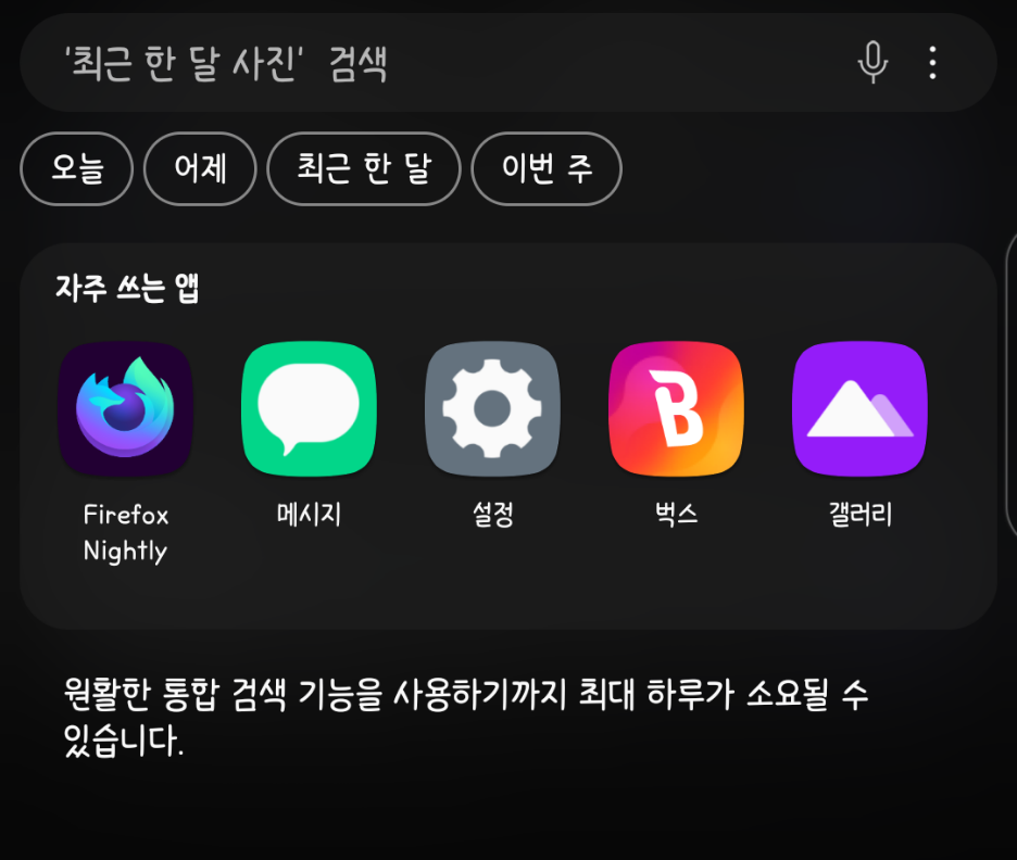 먼저 '맞춤형 검색' 기능은 주로 갤러리 앱 등에서 시간대별로 묶어서 사진을 보여주는 기능 등에서 활용되며, VELVET과 WING에서 탑재된 통합 검색 기능의 '시간대' 검색 (오늘, 어제, 최근 한 달 등)에도 쓰이는 기능입니다. 이 기능이 활성화되면 자주 사용하는 앱이나 위치 정보, 시간 정보를 수집하므로 개인정보에 민감하신 분이라면 이용하지 않는 것을 추천합니다.