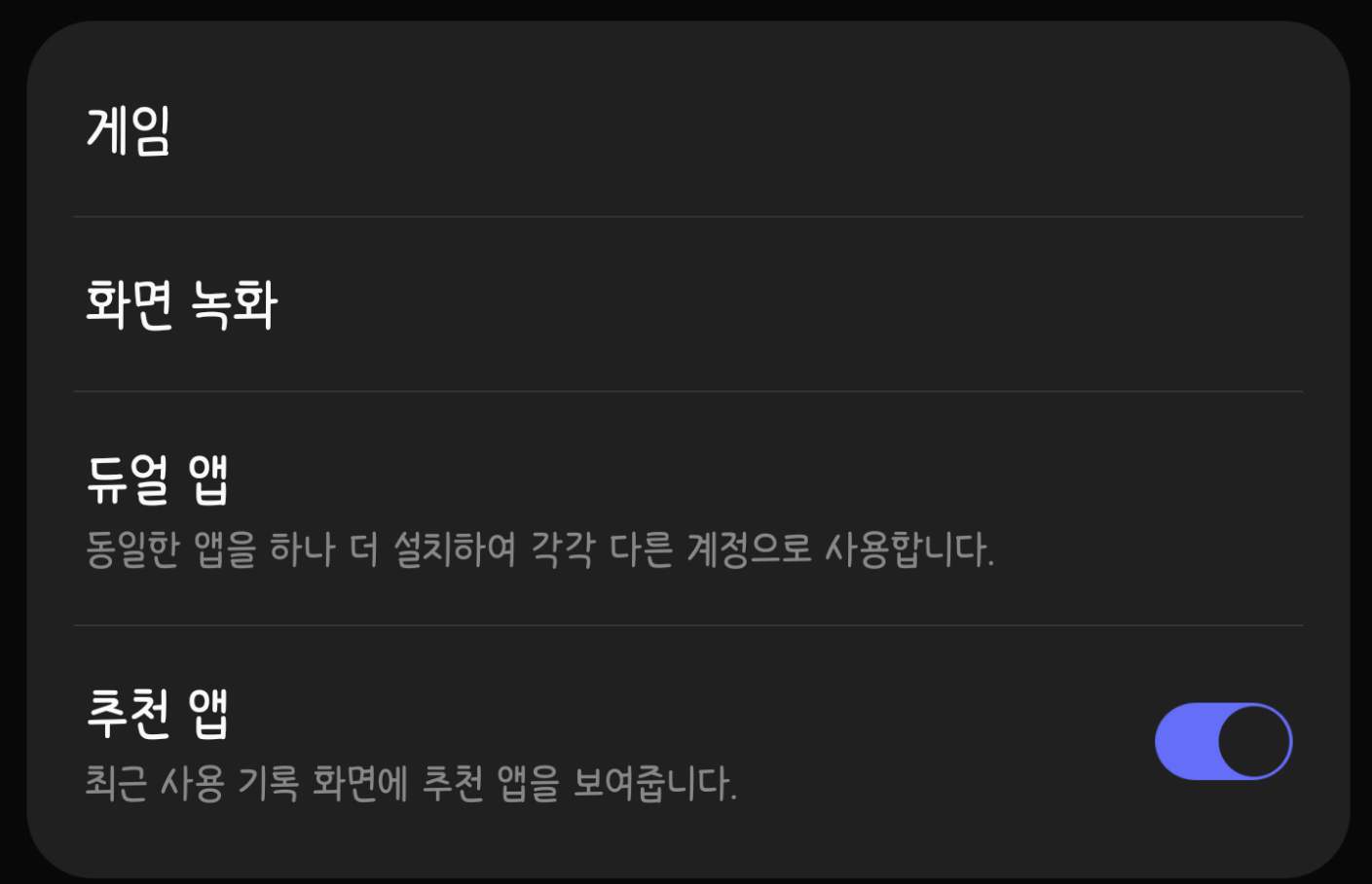 그리고 멀티태스킹 화면('최근 사용 앱' 화면) 하단에 나타나는 한 줄의 앱 목록을 제거하는 기능도 '편리한 기능'에 있습니다. '추천 앱'이라는 명칭으로 불리며, 벨벳 UX 업데이트라고 불리는 업데이트를 받았거나 OS 업그레이드 당시 벨벳 UX가 적용된 일부 기기[각주:5]에서는 이 부분을 해제하는 기능이 존재할 것입니다. 참고로 안드로이드 10부터 변경된 사항에 따라 추가된 기능이므로, 안드로이드 9 이하 버전을 사용하고 계신 분들께서는 해당 설정을 찾으실 수 없을 것입니다.