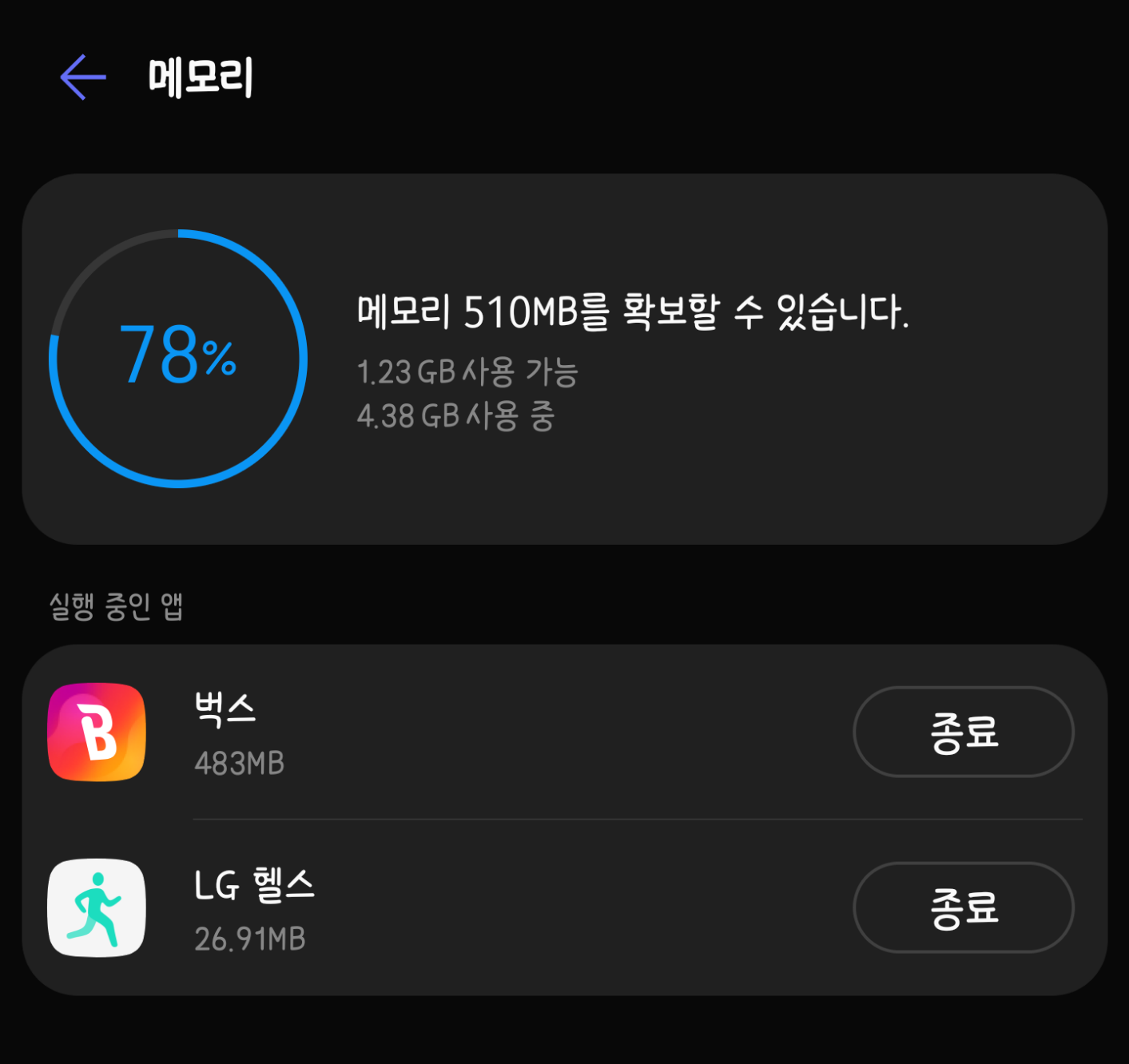 스마트닥터 메인화면에 있는 '메모리', '저장소' 항목은 그 자체로 안내판 역할을 하기도 하지만 누르면 상세한 내역을 확인하실 수 있는데요, 위 사진처럼 메모리 항목은 현재 실행 중인 앱을, 내부 저장소는 분류별 확보할 수 있는 공간을 표시합니다.