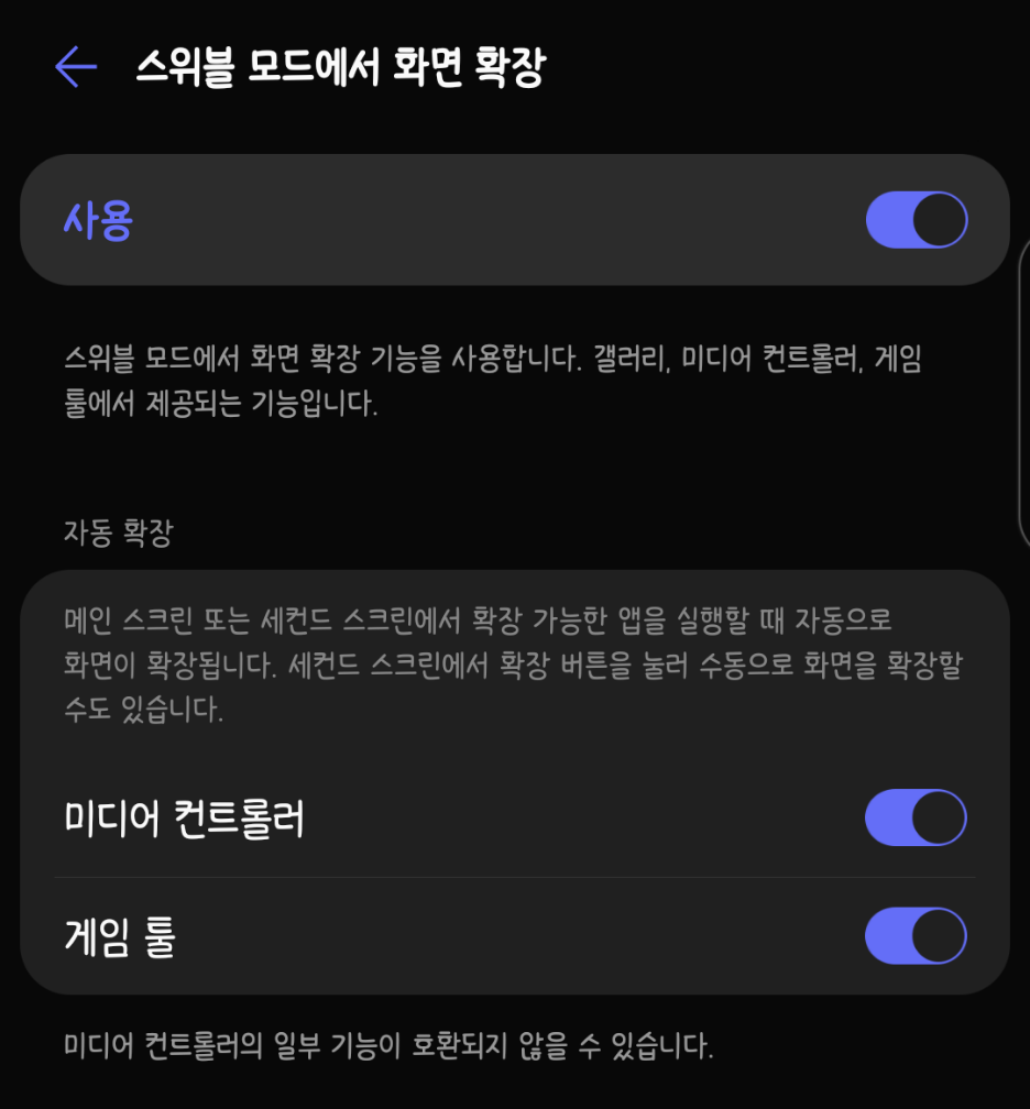 WING에 한정하여, '스위블 모드에서의 화면 확장'이라는 기능도 존재합니다. 이는 메인 스크린에 게임이나 동영상 재생 앱이 실행되고 있을 때, 세컨드 스크린에 미디어 컨트롤러나 게임 툴을 자동으로 실행해주는 기능인데요, 사용 해제하시더라도 세컨드 스크린의 오른쪽 혹은 왼쪽에 존재하는 '<' 버튼을 눌러 실행할 수 있는 만큼 오히려 키보드 사용 등의 이유로 거슬릴 때에는 해제하여 좀 더 편하게 이용하실 수 있습니다.