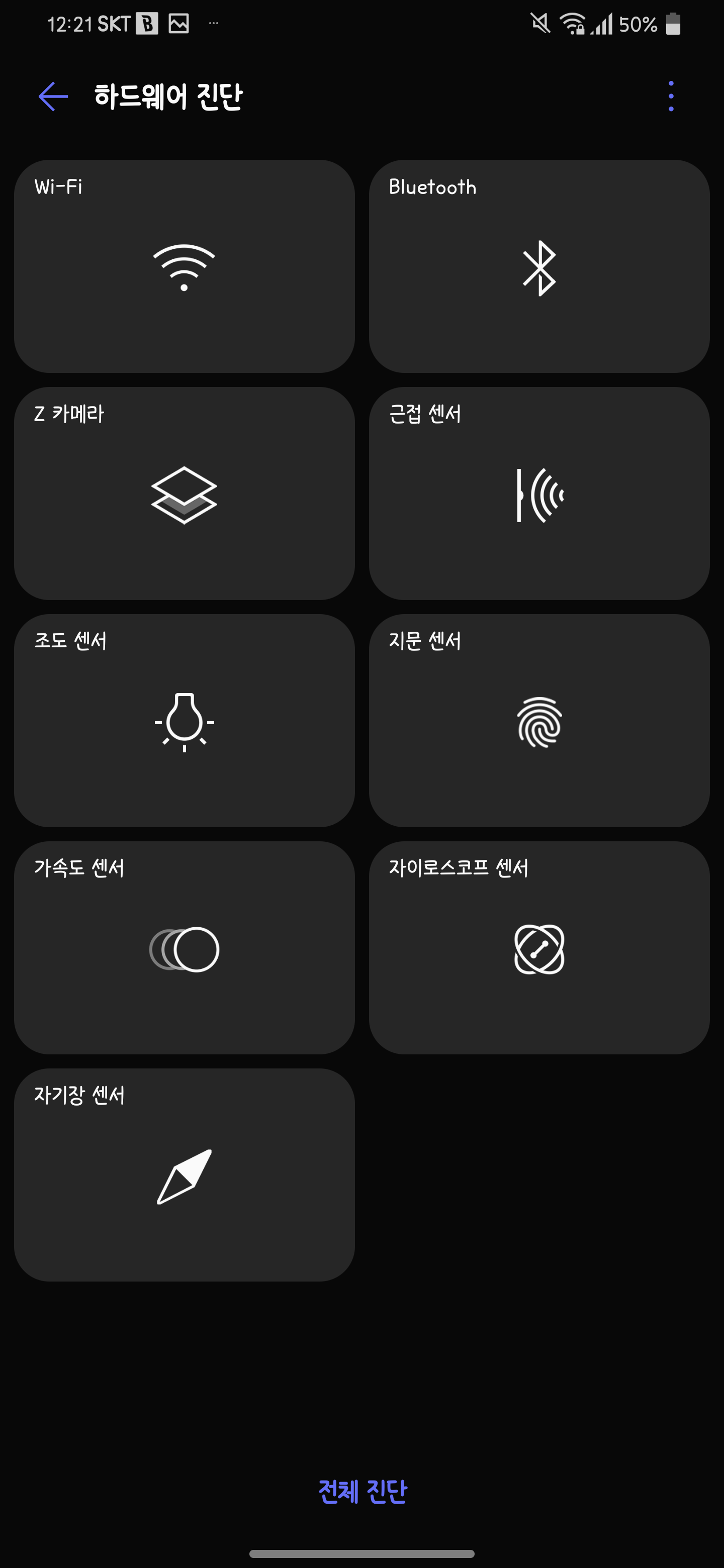 먼저 '하드웨어 진단' 기능은 센서 위주의 작동 여부를 확인해주는 도구입니다. G7 ThinQ 등 지문인식 센서가 갑자기 죽는 현상을 겪는 일부 기기에서 지문 센서의 고장 여부를 판단하는 데에도 쓰이며, Z 카메라라는 이름의 ToF 센서가 탑재된 G8 ThinQ의 경우 Z 카메라 진단도 수행할 수 있습니다. 몇몇 센서는 고장 여부가 겉으로 잘 드러나지 않기 때문에, 보증 기간 내 수리에 매우 중요한 항목 중 하나라 볼 수 있습니다.