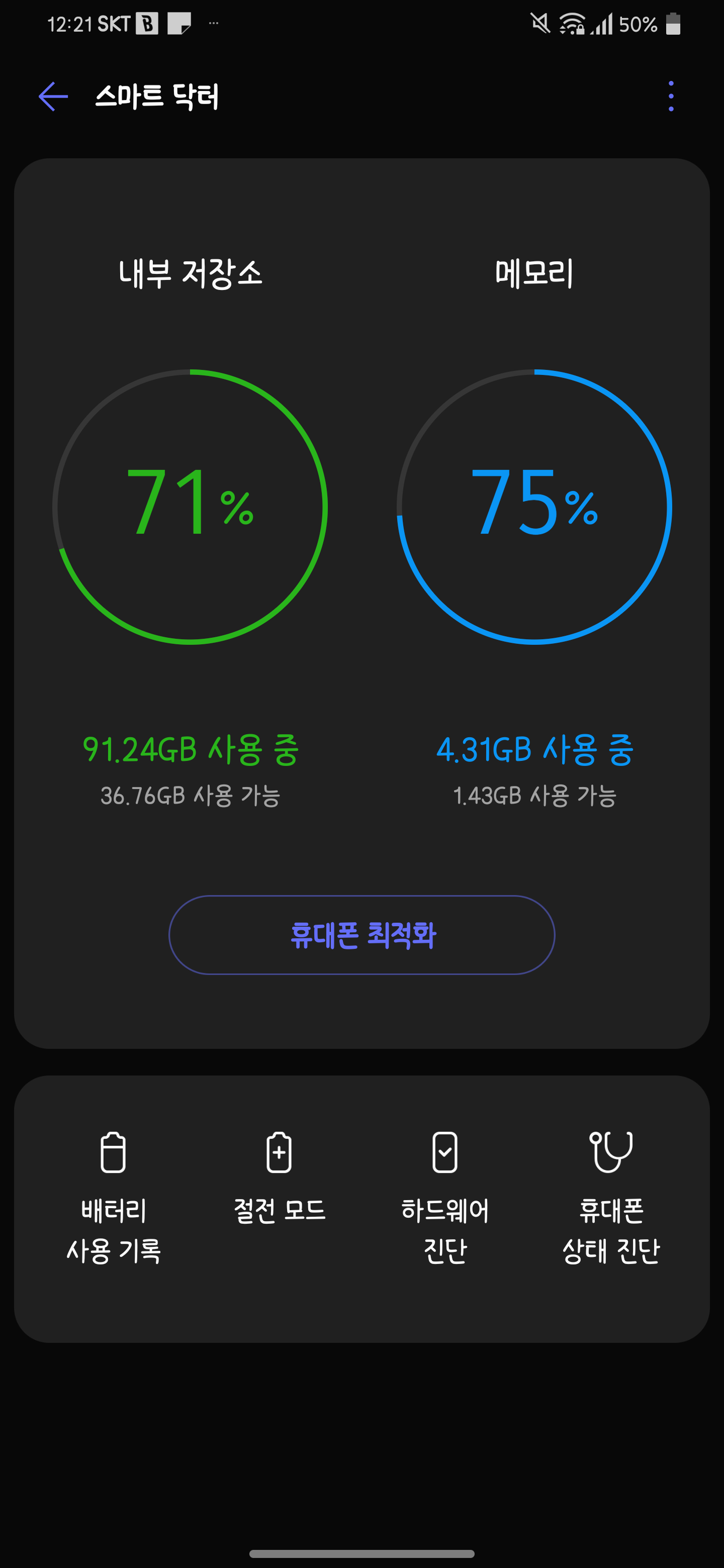 스마트 닥터는 예전 옵티머스 뷰2 등에 탑재되었던 메모리 최적화 위젯과 각종 점검 기능이 합쳐졌다고 보시면 편한 기능입니다.
