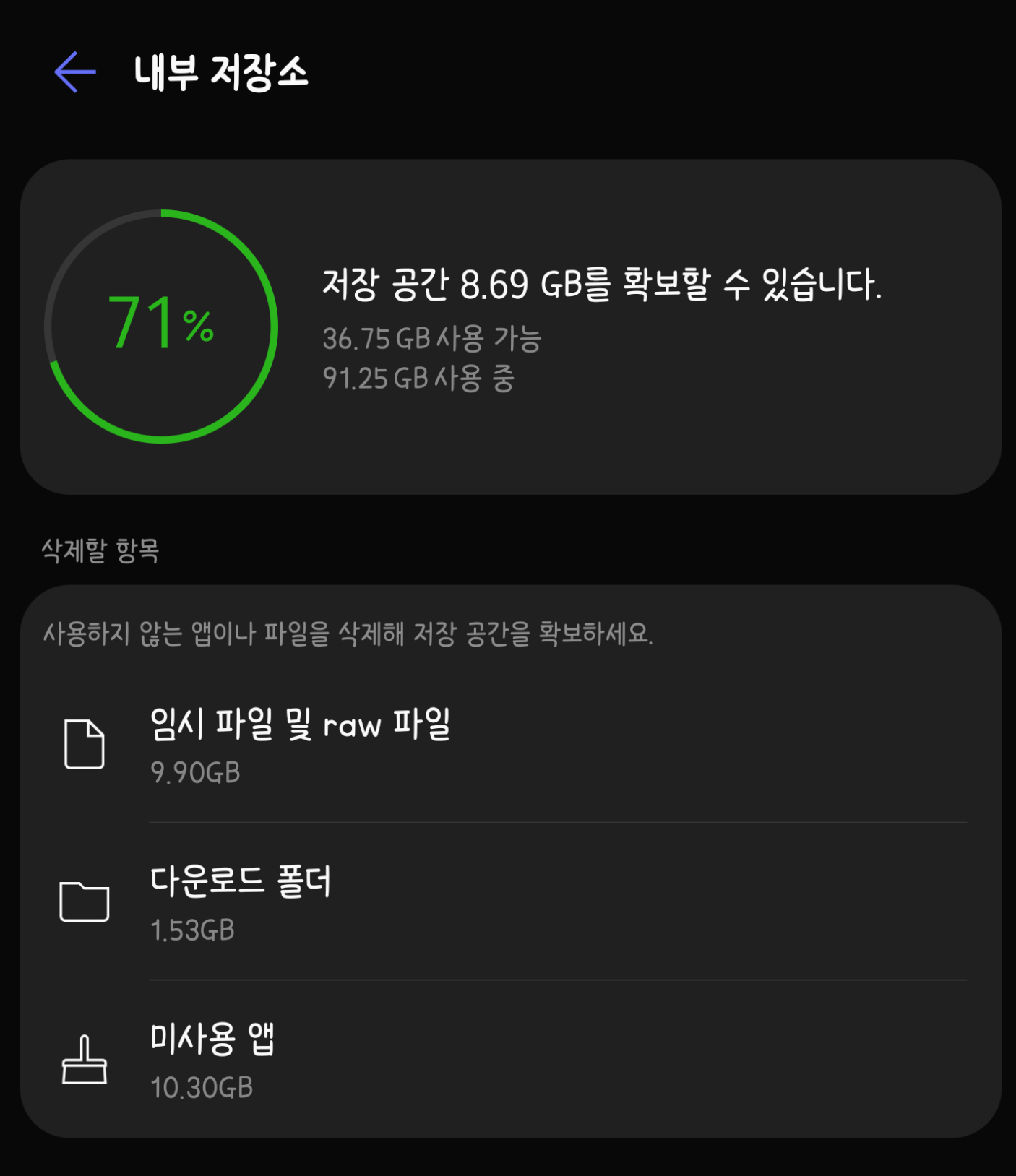 메인 화면의 '휴대폰 최적화' 기능을 이용하시면 이 중 '메모리' 및 '임시 파일 및 raw 파일' 항목에 대해서 삭제 및 정리하는 작업이 진행됩니다.
