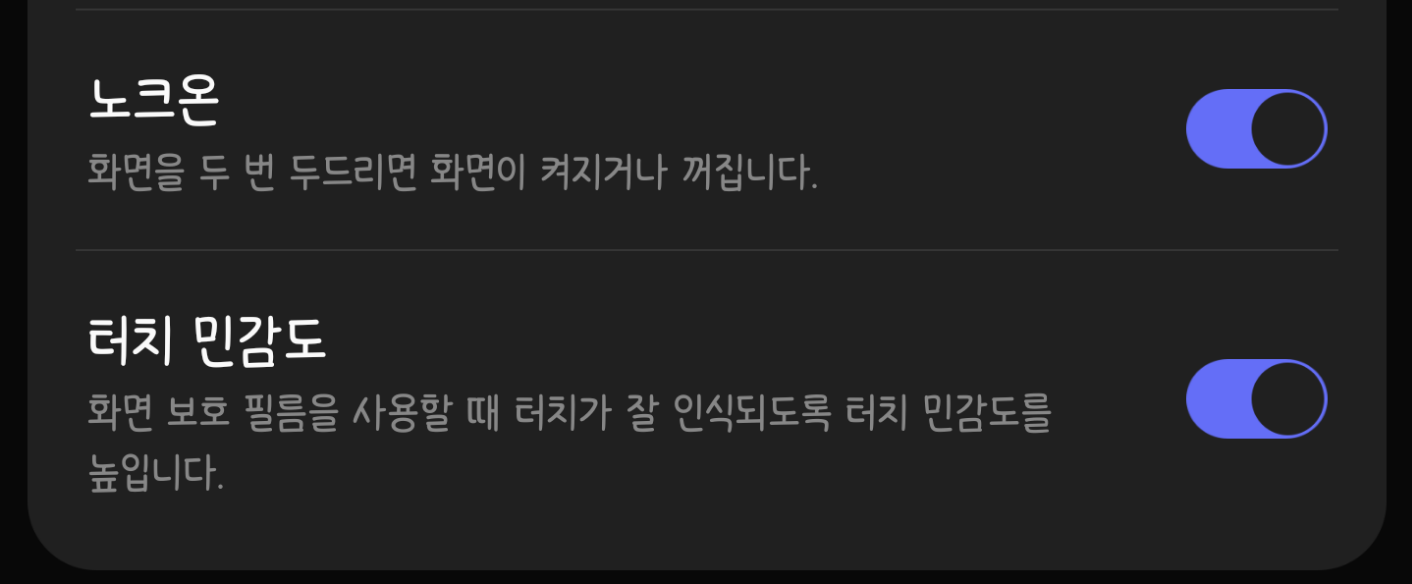 LG 기기에서 흔히 볼 수 있는, 이제는 다른 기기에서도 대부분 가능한 '노크온'과, 강화 유리 등을 장착했을 때 둔해진 터치 반응을 개선할 수 있는 '터치 민감도'도 일부 기종에 한하지만 편리한 기능 분류에 있습니다. 벨벳과 윙은 조금 터치가 둔한 감이 있어서 얇은 우레탄 필름을 사용할 때도 터치 민감도를 켜놓고 쓰게 되더군요. 오작동 위험은 있지만, 그만큼 터치가 민감해지는 만큼 터치 반응에 불만이 있었던 분들께는 유용합니다.