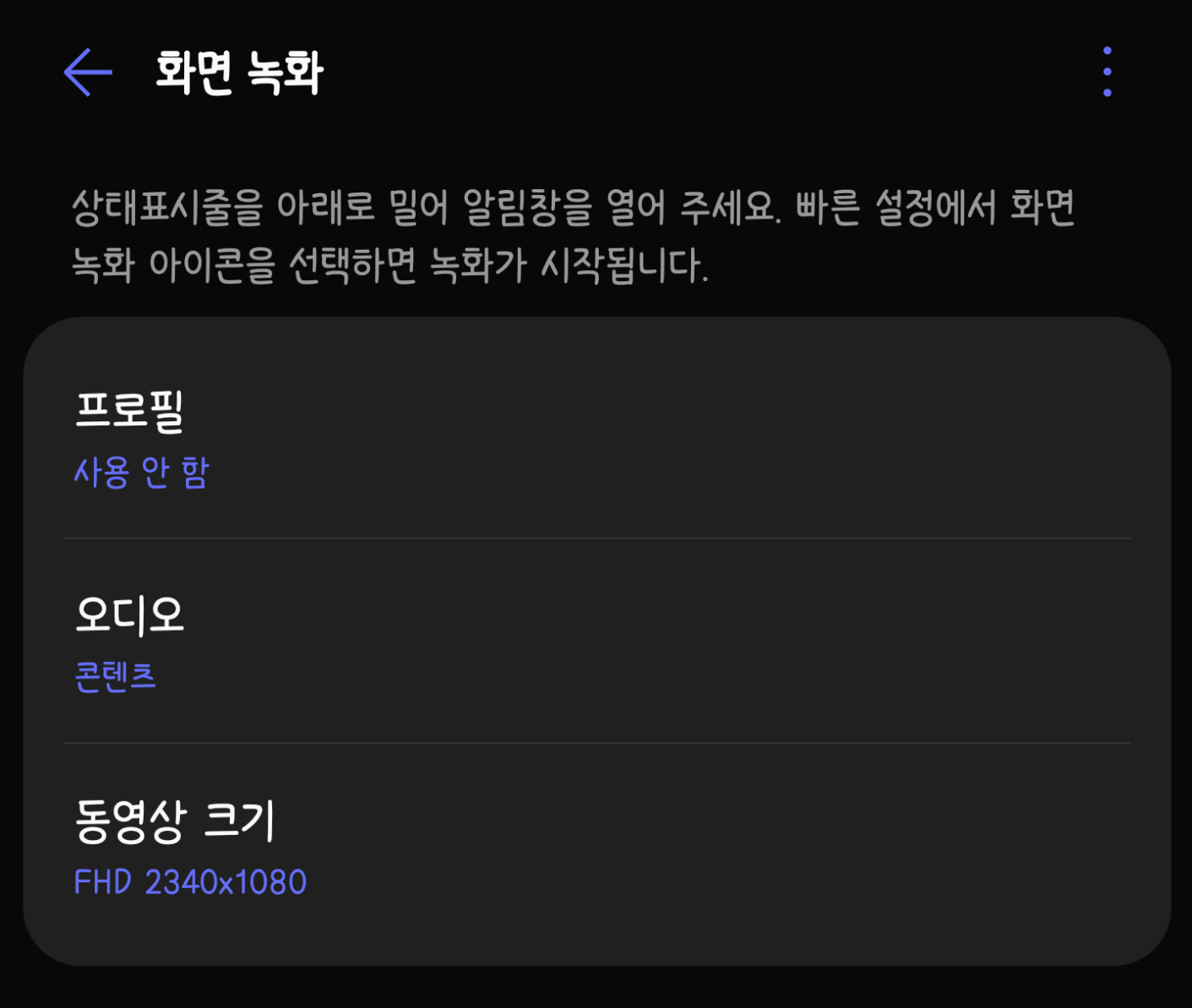* 이 기능은 알림창의 빠른 설정에서 '화면 녹화'를 꾹 눌러서 설정으로 진입하는 것도 가능합니다.